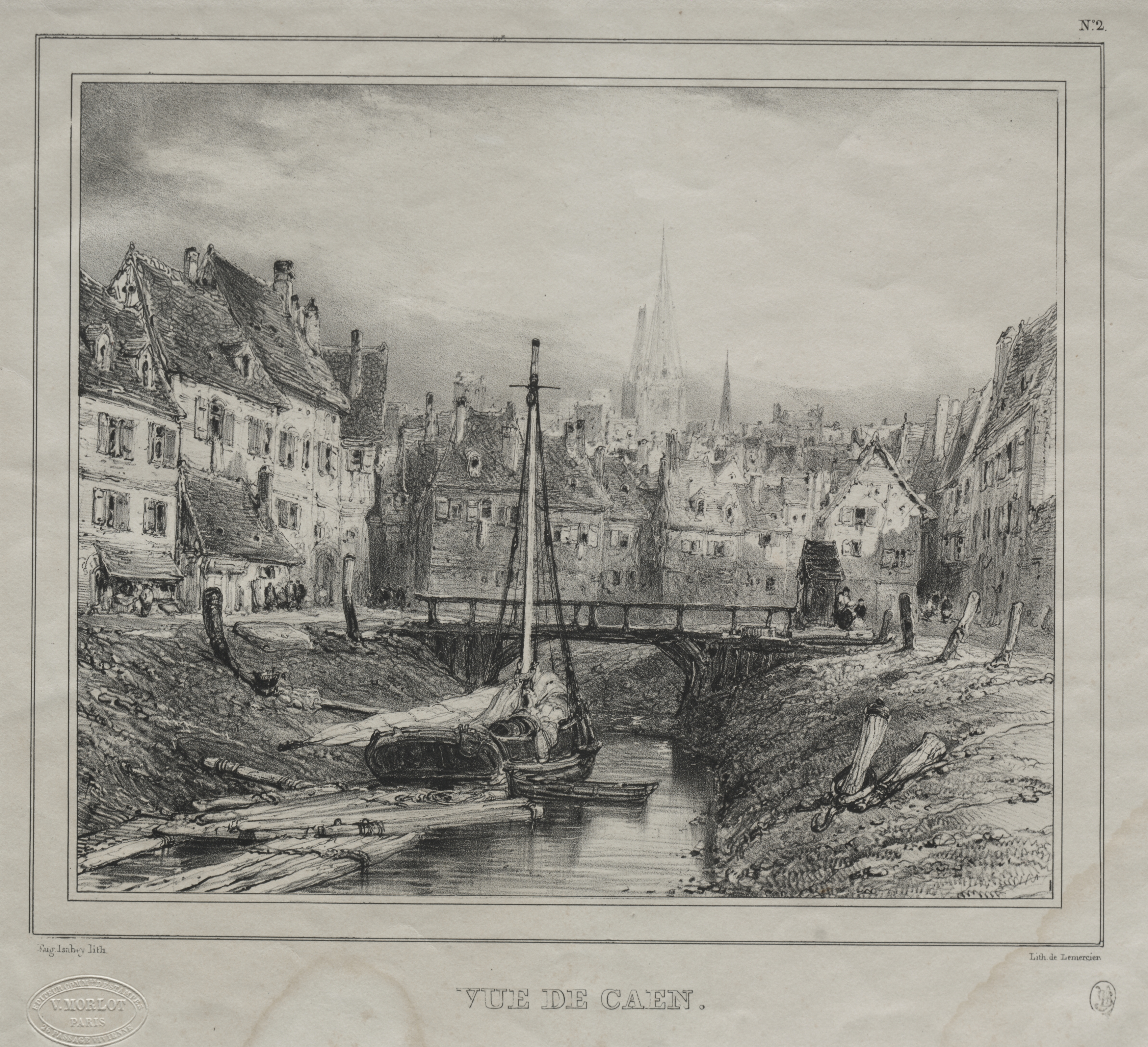 Black and white drawing depicting a canal scene with a small boat and bridge; multiple buildings line both sides of the canal; the buildings vary in height and width; most roofs are steeply pitched; a spire rises prominently in the distance; the sky appears cloudy; a boat with a single mast sits on the canal; wooden planks line the canal banks; several people are scattered throughout the scene; text at bottom reads "VUE DE CAEN".