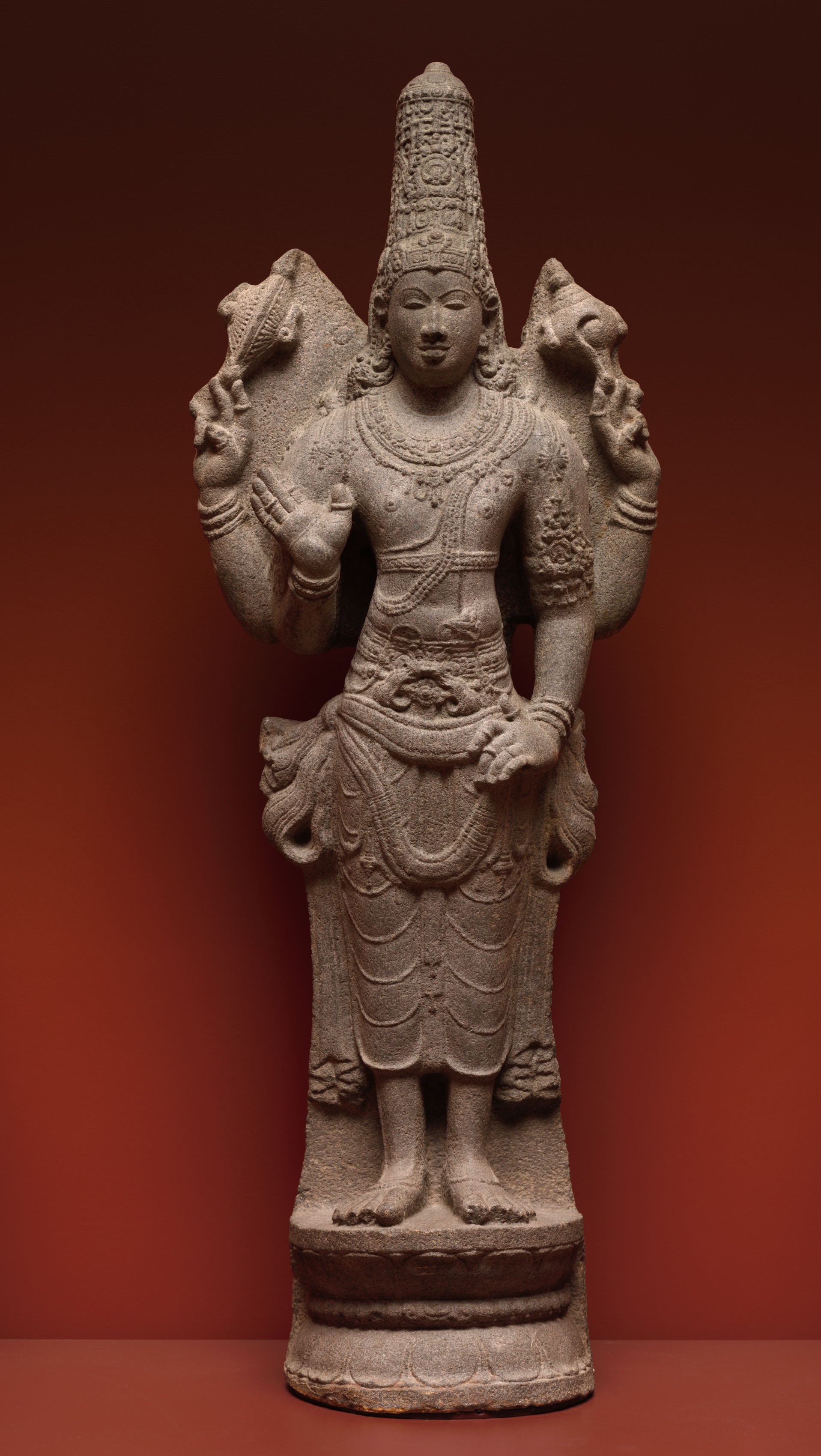 The image depicts Vishnu. The statue shows a figure with four arms and a tall, conical headdress. The figure is wearing a long skirt and multiple necklaces. Two of the arms are bent at the elbow with hands in front of the chest. The other two arms are bent at the elbow with hands near the sides of the body. The figure has a serene expression on its face. The statue appears to be made of stone and is standing on a circular base. The background is a gradient of dark red to light red.