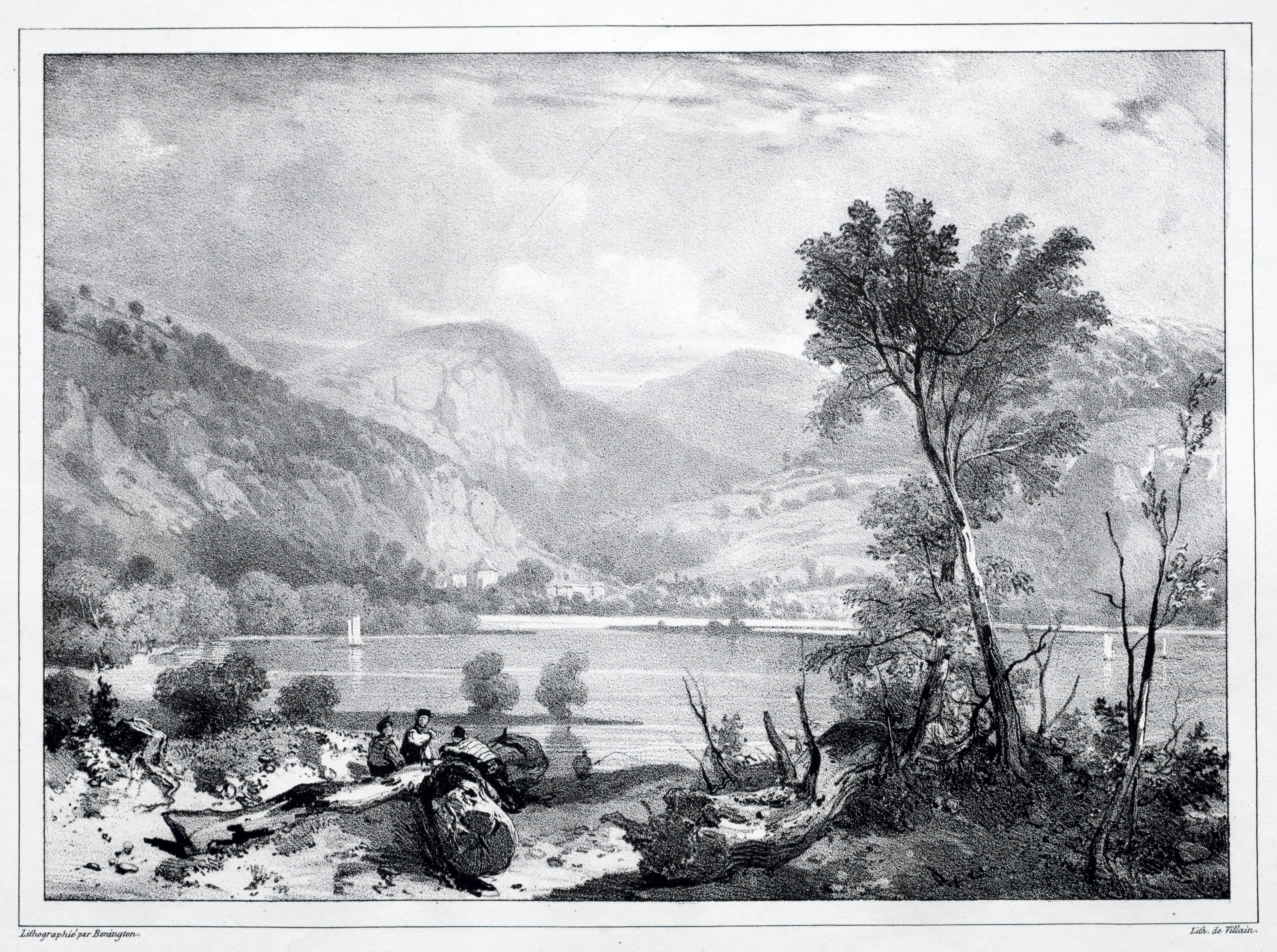 Black and white landscape drawing of a large body of water. A tree and various foliage presented in the foreground. A town bordered by trees along the shoreline on the left center and mountain range in the background under cloudy sky. A person sitting on a rock in the lower center. A pile of logs on the ground in the center lower.