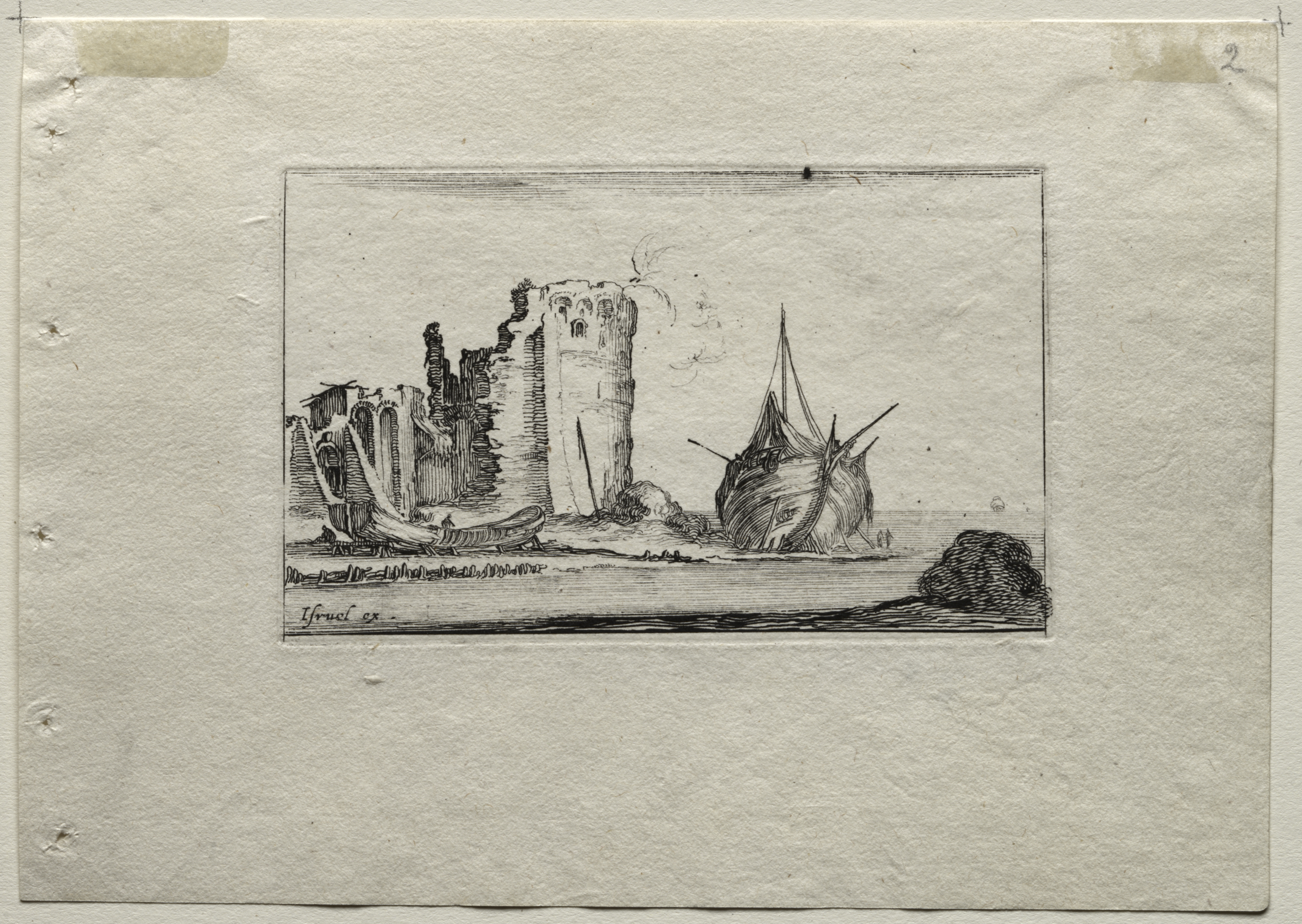 The image depicts a black and white drawing of a seascape with a ruined tower and a ship. The drawing is rectangular, centered on a piece of aged paper with a rough texture. The paper has tape residue in the top corners and several small holes along the left edge. The drawing itself is bordered by a thin line. In the drawing, a large ruined tower stands on the left, with a curved wall extending to the left. The tower has several windows and appears to be crumbling. To the right of the tower, there is a ship with its sails down, and to the right of the ship, there is a large rock. The background of the drawing is a flat, open sea. The artist's signature is visible in the bottom left corner of the drawing. The overall style of the drawing is detailed and realistic. The title of the piece is "Caprices: Marine" and the artist is Stefano Della Bella.