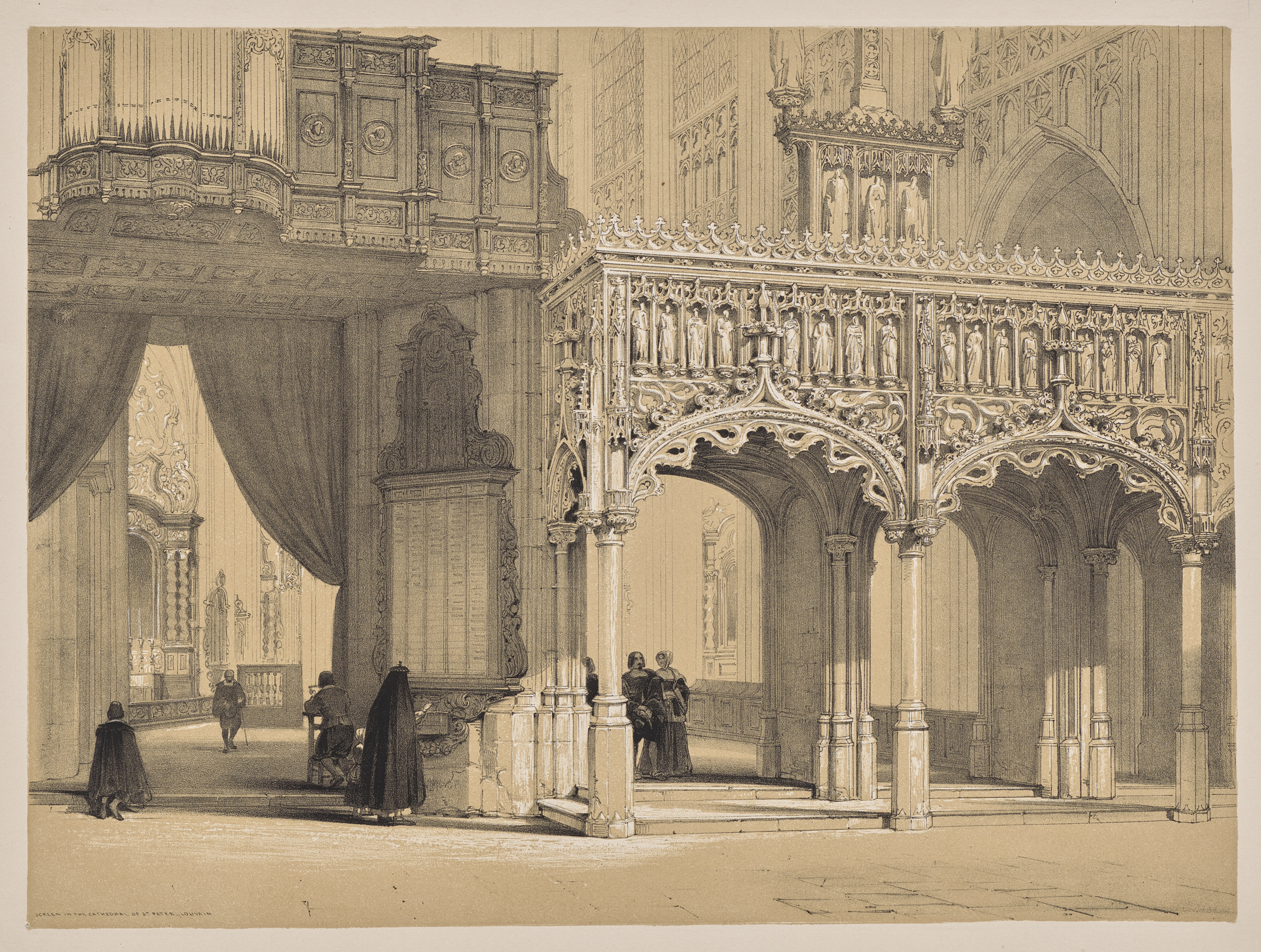 Screen in the Cathedral of St. Peter, Louvain. Sepia-toned drawing of interior of a cathedral. Ornate screen with arches and columns, featuring statues. The screen has a balcony on top with decorative elements. People in dark clothing are standing or walking around. There is a large curtain on the left. The floor appears to be stone. The walls and ceiling have detailed architectural features.