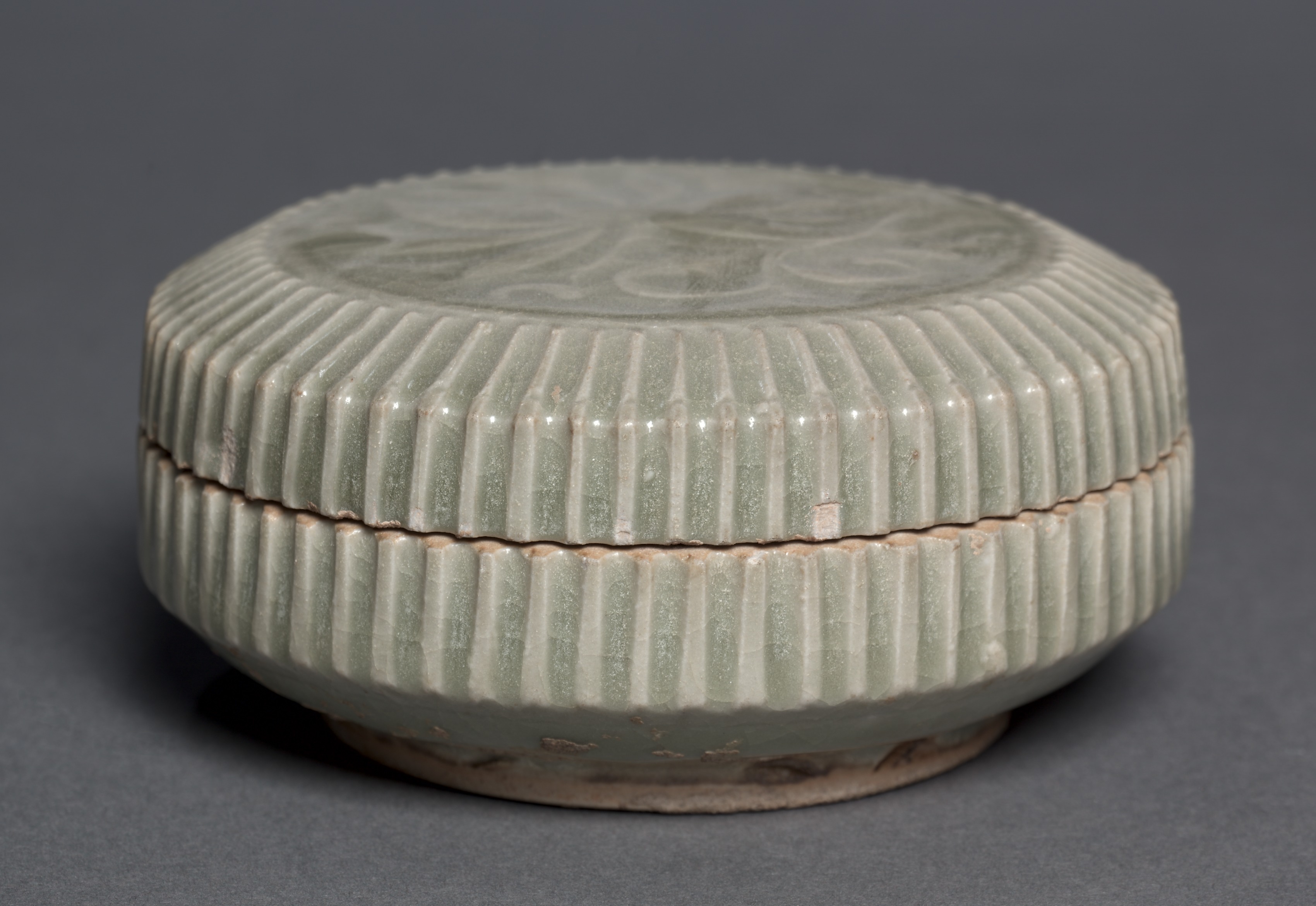 Pale green ceramic covered box with carved floral design on top surface; box and cover have ribbed vertical lines around exterior; base of box is flat; background dark gray. Covered Box with Carved Floral Design: Yaozhou Ware.