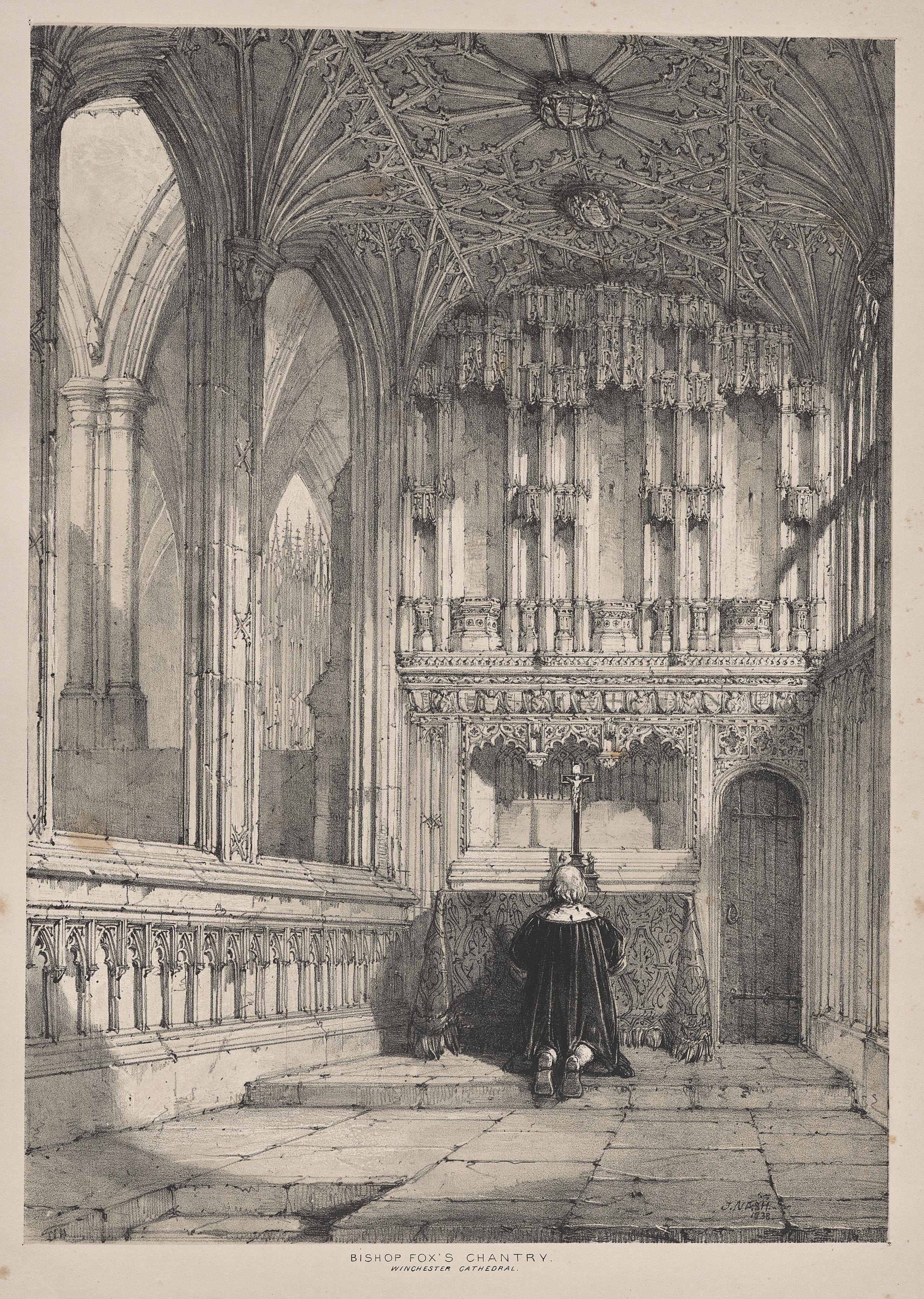 Black and white drawing of the interior of a cathedral. A man in clerical attire with white hair and back turned to viewer kneels in prayer. He wears a long dark robe. A stone floor with a short wall and pillar on the left. A large ornate stone screen with cross on top behind the man. The screen and wall have intricate carvings. Arches and vaulted ceiling. A door on right wall. Text at bottom centre reads "Bishop Fox's Chantry, Winchester Cathedral".