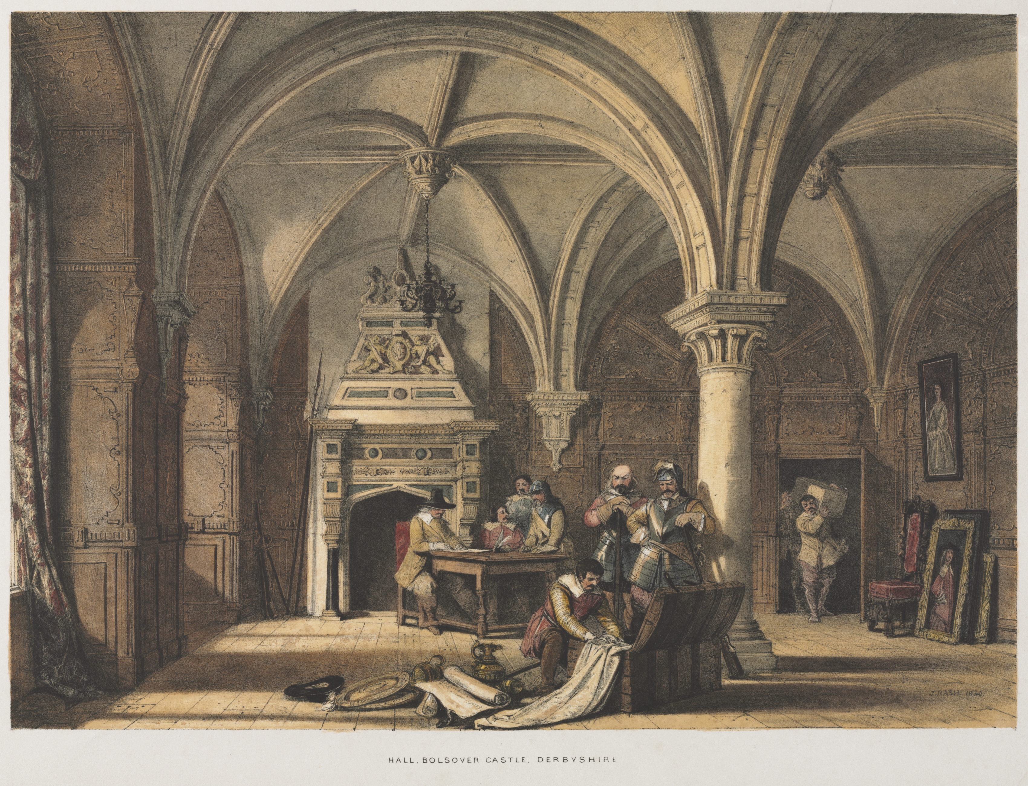 The image depicts a large room with a vaulted ceiling and arches. The room has stone walls, a tiled floor, and a large stone fireplace with a decorative mantelpiece. Several people are in the room, some standing and some seated. One person sits on the floor, unrolling a large piece of paper. A table and chairs are in the center of the room. A column stands to the right of the table. Three portraits lean against the wall on the right side of the image. A man in the background carries a large stack of papers. The room has a chandelier hanging from the ceiling. The overall atmosphere suggests a historical setting.