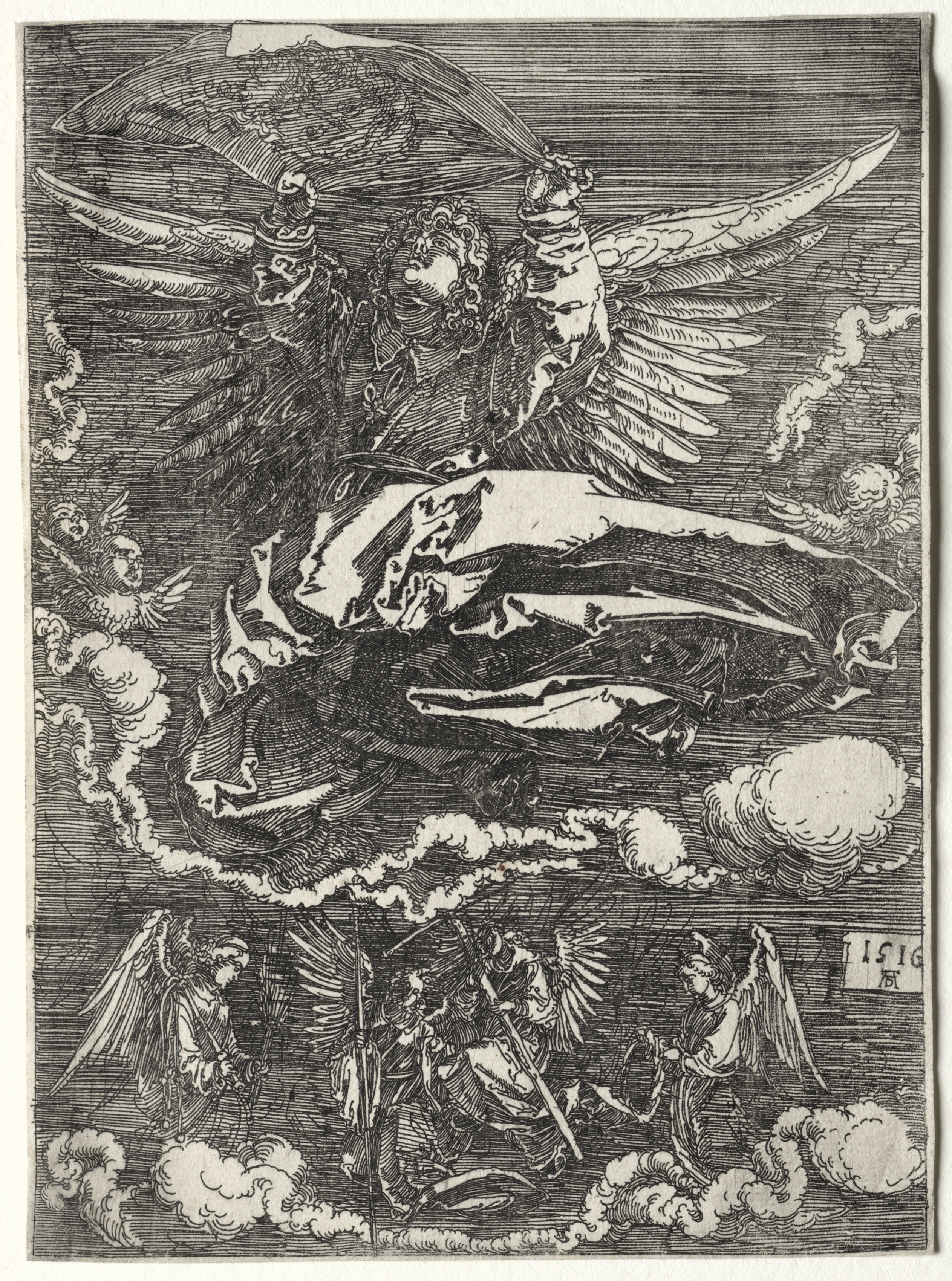 Black and white image of an angel with very large wings. The angel is holding a cloth or sheet. The angel is surrounded by clouds. There are three smaller angels with wings at the bottom. Two of the smaller angels are holding trumpets. One of the smaller angels is on the left, one in the middle, and one on the right. The image has many lines, suggesting it is an engraving or etching. The image is rectangular.
