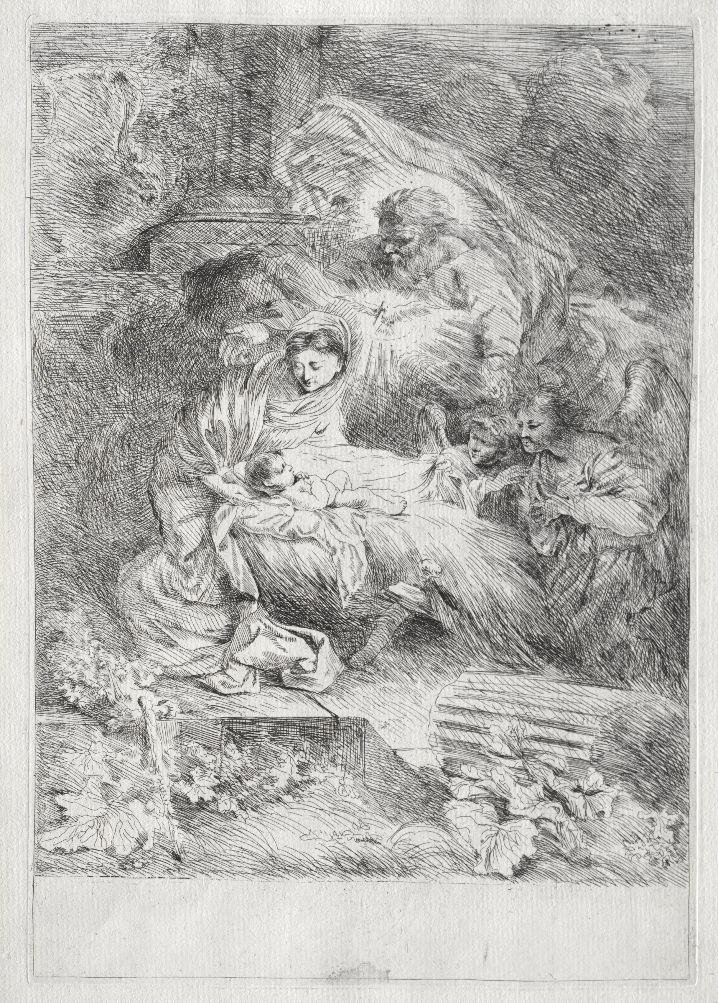 The image depicts a grayscale drawing of a religious scene. A woman sits on a stone bench holding a baby, likely Jesus. She sits in center with her head slightly bowed and looking down at the baby. There are three wise men or shepherds to her right, with their heads bowed also looking at the baby. A man and a bird-like creature are floating above them. The background is a rocky area with plants at the bottom. There are heavy lines and shading throughout the drawing.