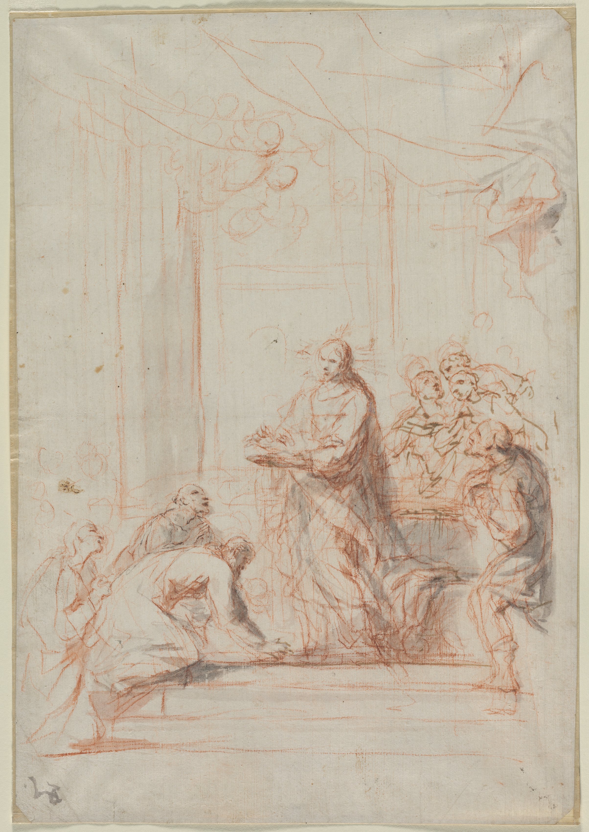 A sketch of a religious scene in red and grey pencil on off-white paper. The scene depicts a central figure in a long robe holding an object in front of their body with both hands. The figure appears to be standing on a platform or step, and is surrounded by other figures. Seven figures are present. The central figure stands in the center and there are three figures on either side. The three figures to the right are on a lower level than the central figure. The two figures to the left are on a similar level to the central figure. The figure on the far left is bending forward at the waist. The room has a flat ceiling with some kind of decorative element hanging from it. The walls appear to have vertical lines running down them. The paper has a thin tan border around the edge. The paper appears slightly discolored and has some darker spots.