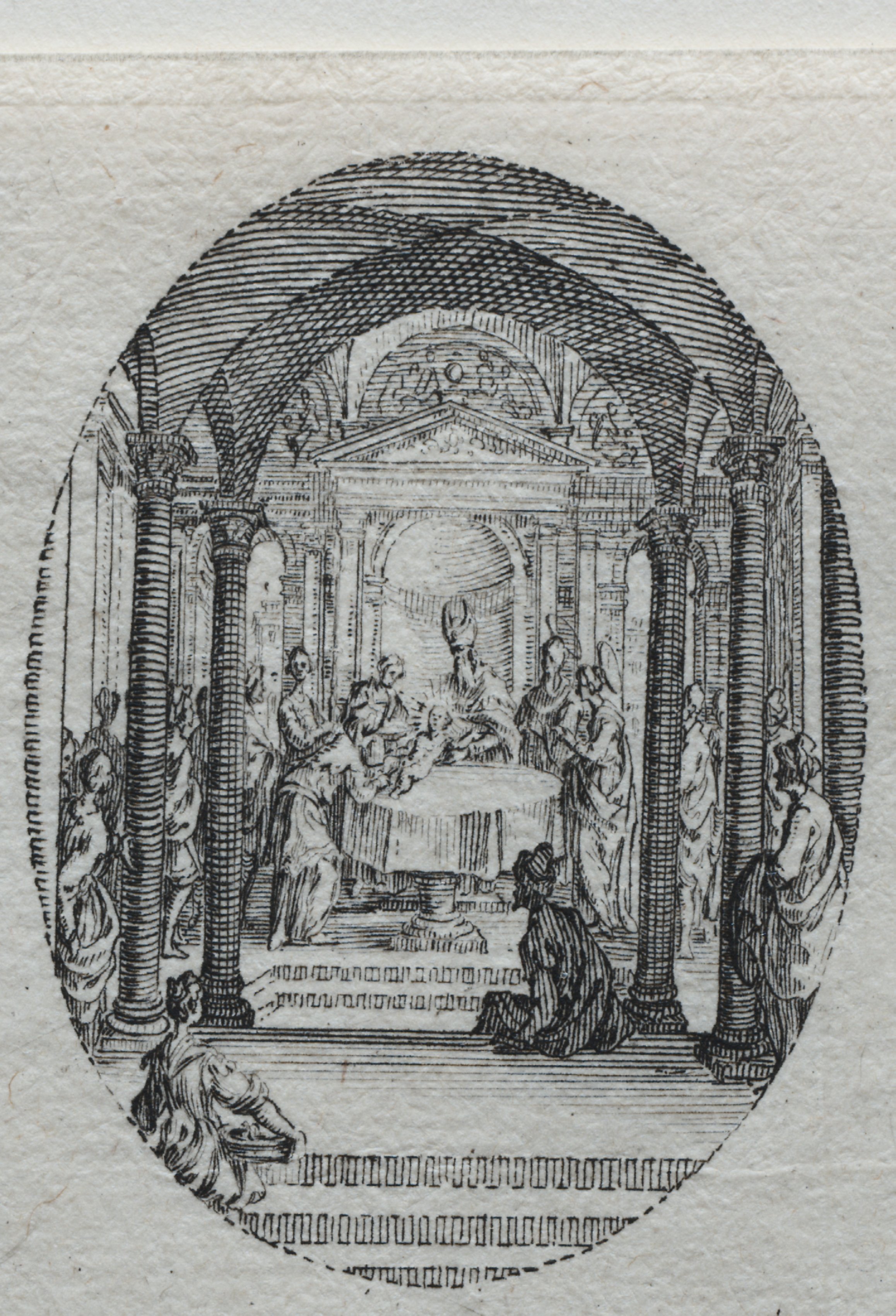 Black and white drawing of a scene depicting The Circumcision. The scene is circular and shows a group of people in a building with columns. A table is in the center of the room with people gathered around it. A man sits at the table with his genital area exposed and a man to his right appears to be cutting him. A woman sits on the floor at the bottom of the image. The background shows an arched ceiling and additional archways. The artist's name is Jacques Callot and the title is "The Mysteries of the Passion: The Circumcision".