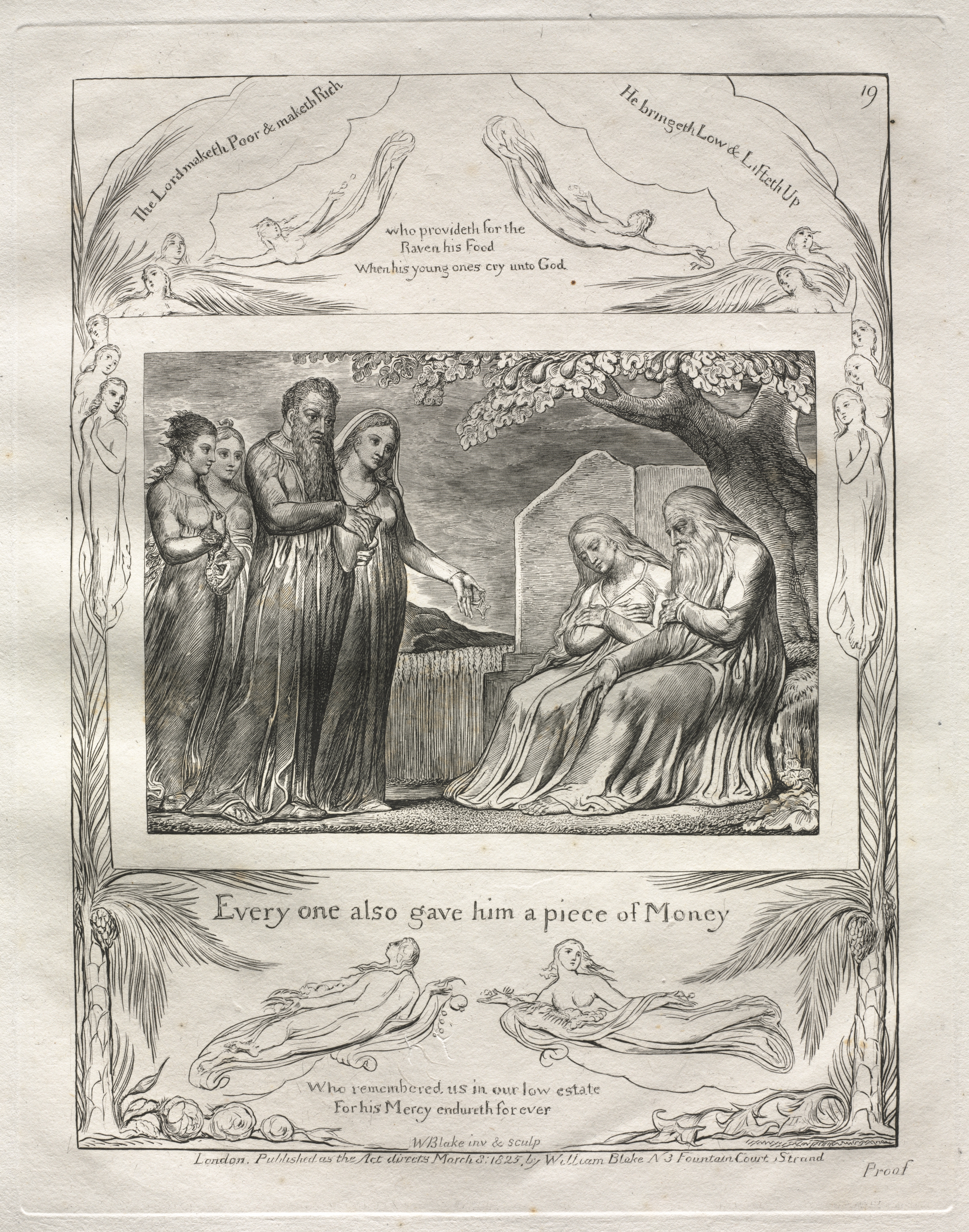The image depicts a page from a book with a black and white illustration. The illustration features an inner rectangular frame containing a scene with two men and three women. One man and two women are standing on the left, while the other man and woman are seated on the right. The standing man has a beard and wears a head covering; the seated man also has a beard and long hair. The standing women wear long dresses, while the seated woman wears a head covering and a long dress. The background includes a cloudy sky, a tree, and a house. The outer frame features various illustrations and text. At the top, two curved lines of text read "The Lord maketh Poor & maketh Rich. He bringeth Low & Lifth Up." Below this are two lines of text: "who provideith for the Raven his Food When his young ones cry unto God." The bottom of the frame features two reclining figures and text that reads "Every one also gave him a piece of Money." Additional text at the bottom includes "Who remembered us in our low estate For his Mercy endures for ever" and credits the artist with "W. Blake inv. & sc." The page number "19" is visible in the top-right corner.