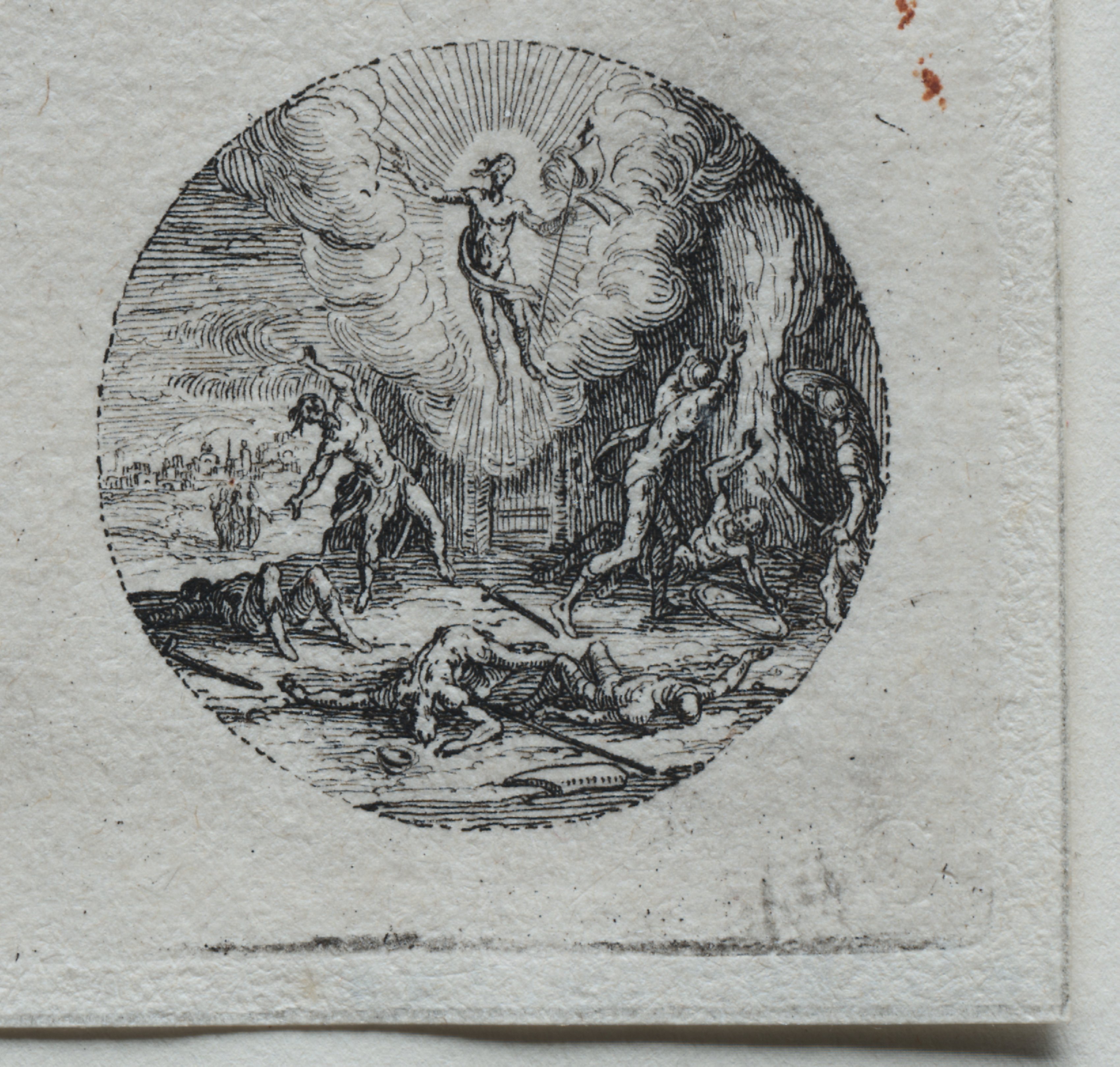 The Mysteries of the Passion: The Transfiguration by Jacques Callot. Black and white circular illustration on textured white background. A radiant figure with a halo and long hair stands on clouds at the top center. The figure has one arm outstretched and holds a staff or spear in the other hand. Below and to the left, several people are on the ground or standing. Two bodies are on the ground in the center foreground. A cityscape with buildings appears in the background to the left. The sky has lines suggesting movement or wind. The illustration is detailed with many lines and shading. Some figures appear to be dressed in simple clothing. The overall scene has a dramatic and dynamic feel.