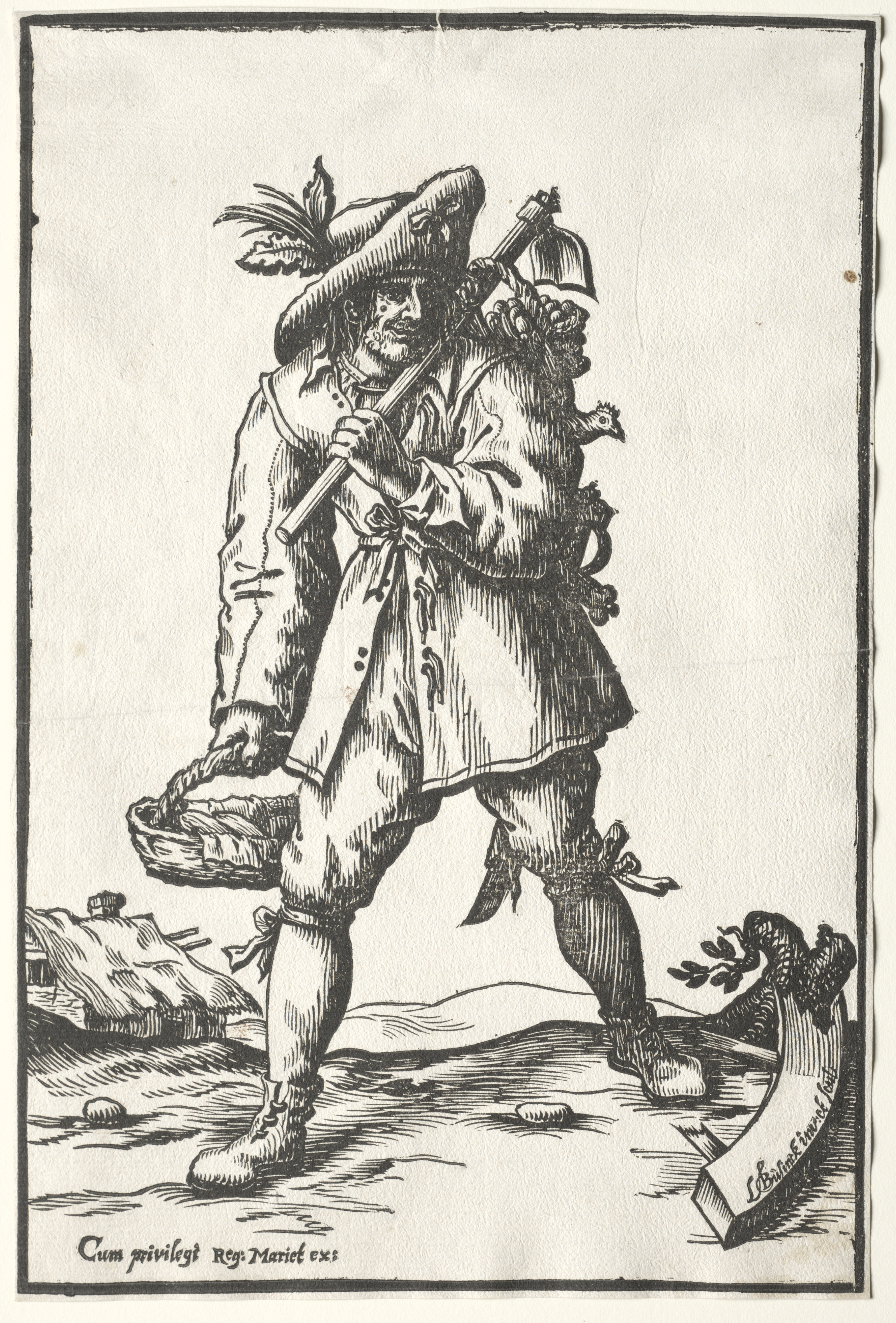 Black and white image of a man in old-fashioned clothing, holding a hoe over his right shoulder and a basket in his right hand. The man has a long coat with a sash around his waist and a hat adorned with a feather. His pants are tied just above the ankle. A rooster is near his left foot. He stands on a dirt path with a pile of items on the left. The background is plain. The image has a border.