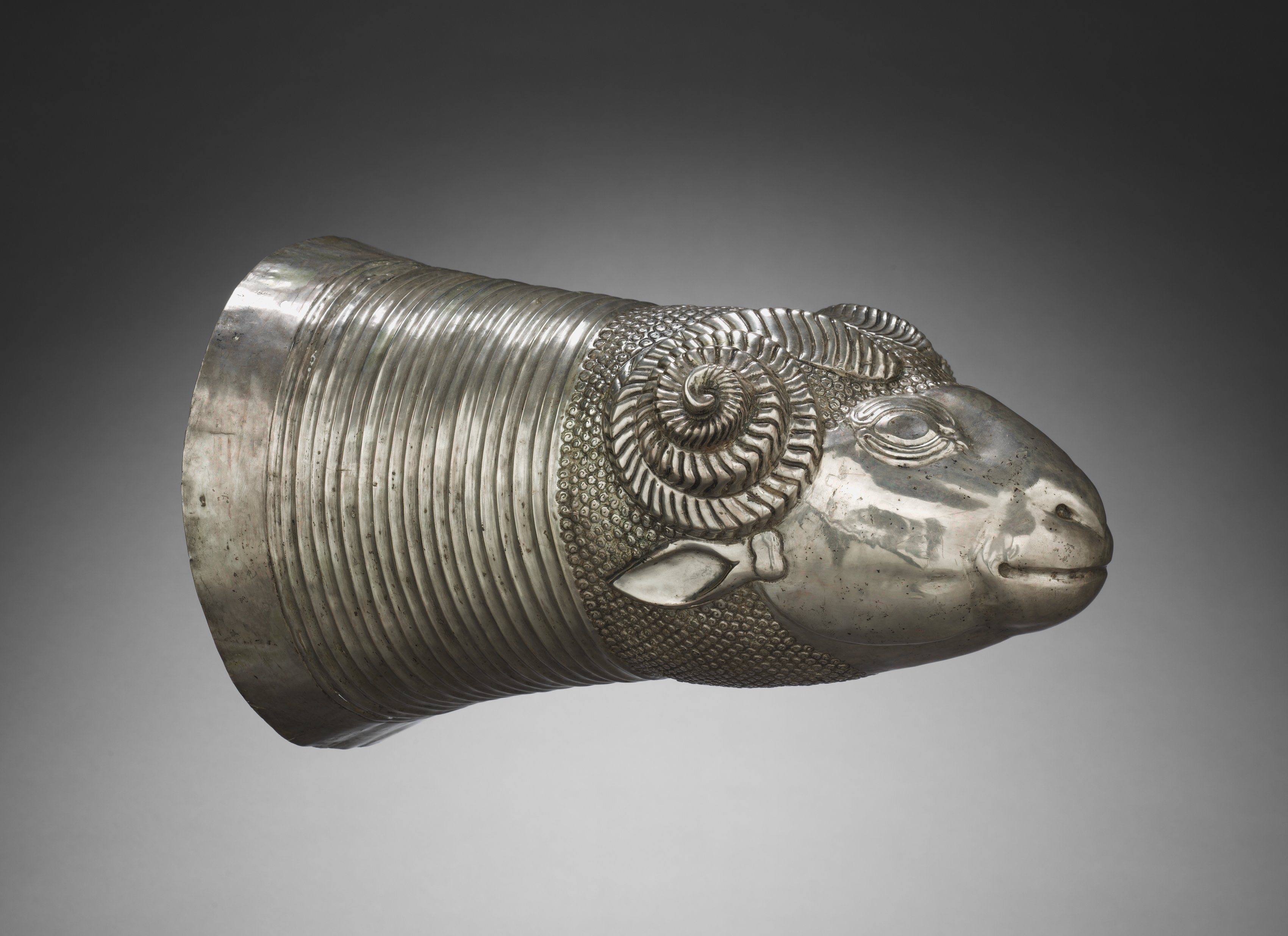 Silver-colored metal vessel in the shape of a ram's head. The vessel is oriented with the opening on the left side and the ram's head on the right. The body of the vessel is cylindrical with 16 horizontal grooves. The ram's head is protruding from the right side, made of the same metal, with a curled horn on top of its head. The ram has a textured body with small dots and lines. The background is a gradient from dark gray at the top to light gray at the bottom. The ram's head is titled by the name "Ram-Head Drinking Vessel".