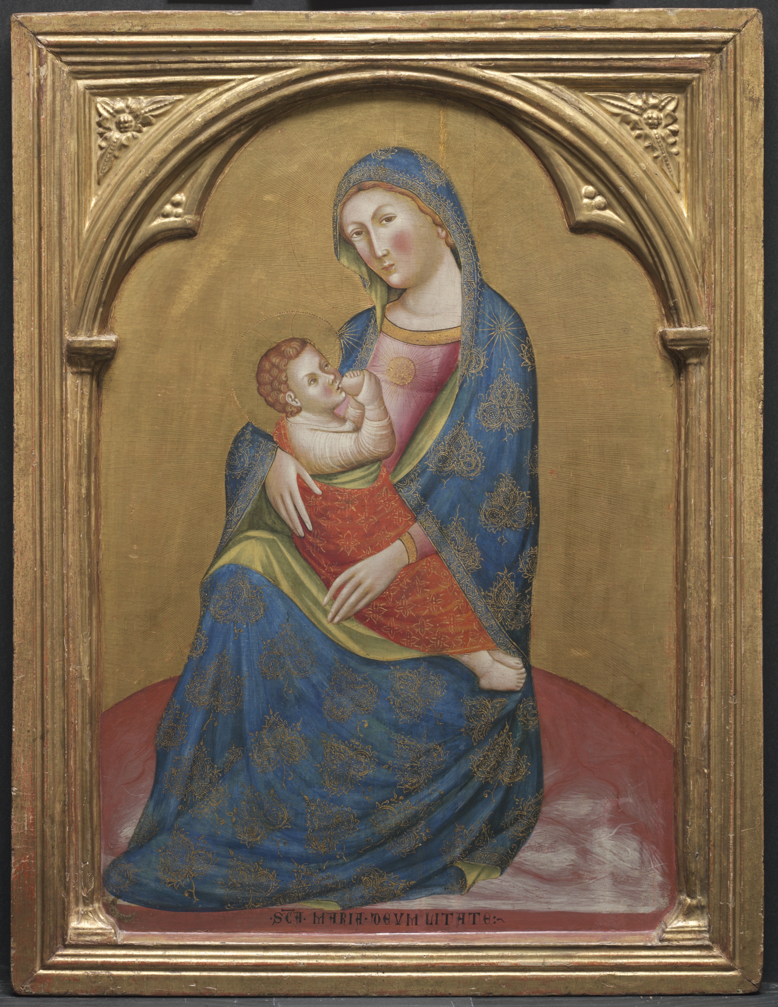Gold-framed painting of a seated woman in a blue dress with gold accents holding a child. The woman's head is covered with a blue cloth. The child wears a red dress with gold accents. Both figures have fair skin. The woman's dress is blue with gold floral patterns. The child sits on the woman's lap, turned towards her. The background is gold, with a red and white cloth underneath the figures. The frame has an arched top with ornate details. The painting depicts the Madonna and Child. The artist's name suggests a 15th-century Italian style. The woman's robe features at the bottom an inscription in black text.