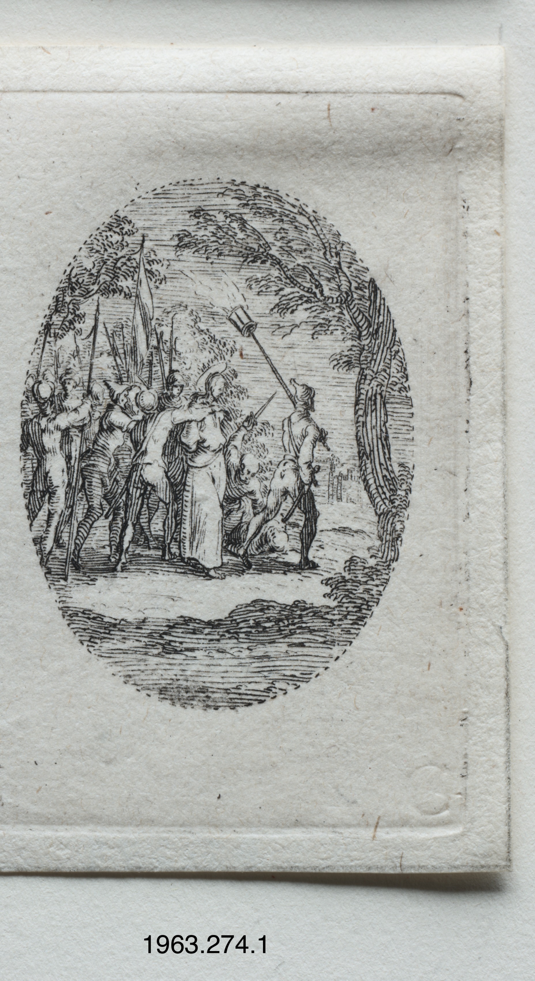 The Mysteries of the Passion by Jacques Callot. An oval illustration on a white background depicts a group of people in armor and one in a long dress. A man on the right holds a torch. Several men in armor are on the left. A tree trunk is on the right side. The scene appears to be outdoors. The illustration is in black and white. The artwork has a raised border. The image shows a curled top edge.