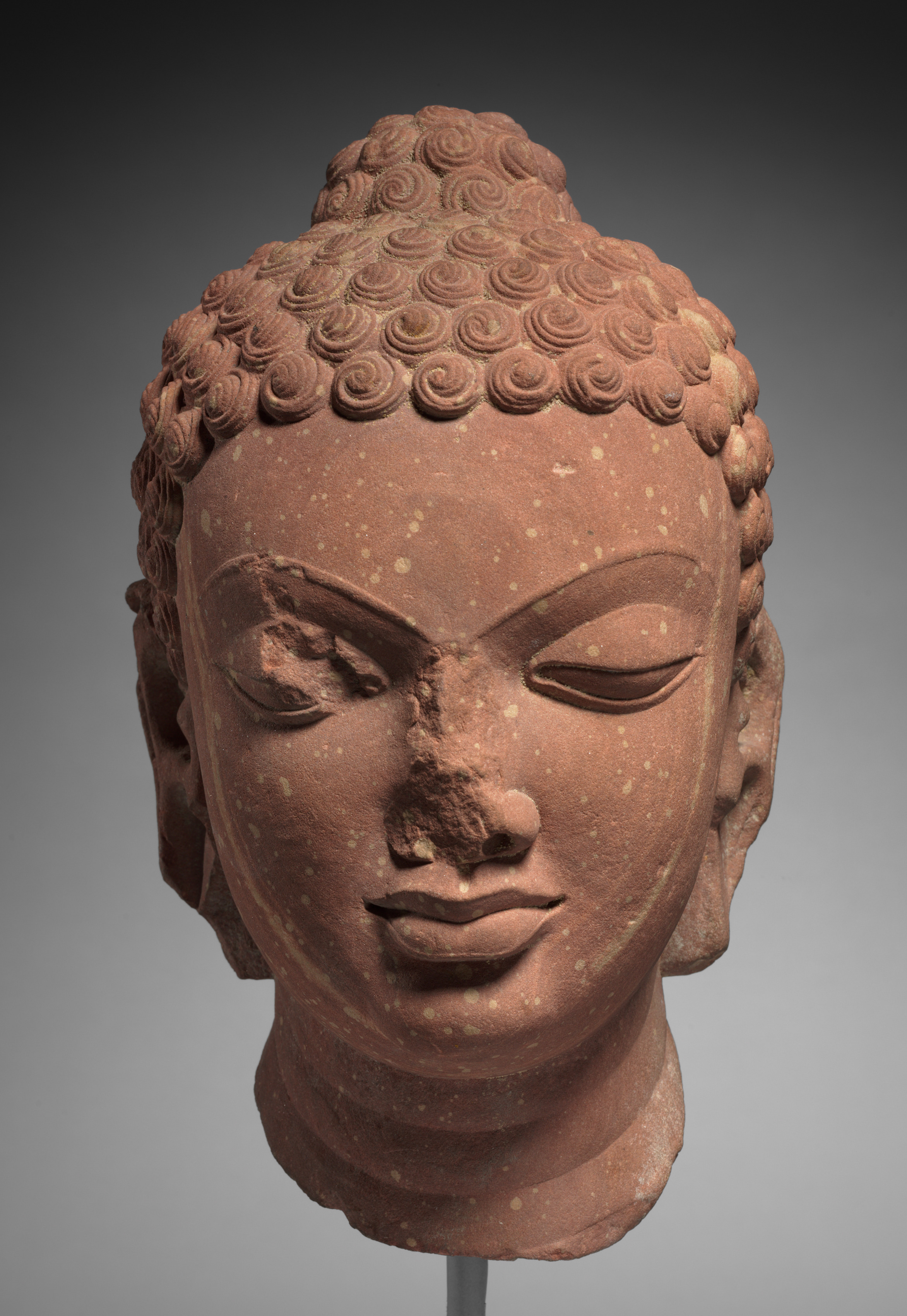 Reddish-brown stone head sculpture of Buddha. The head is tilted slightly forward. Eyes are closed. Eyebrows are arched. Nose is straight and proportional to face. Lips are thin and slightly pursed. Face is long and oval-shaped. Skin has small beige spots. Curly snail-shell-shaped curls cover the top and sides of the head. Background fades from dark gray at top to light gray at bottom. A thin metal pole supports the base of the sculpture.
