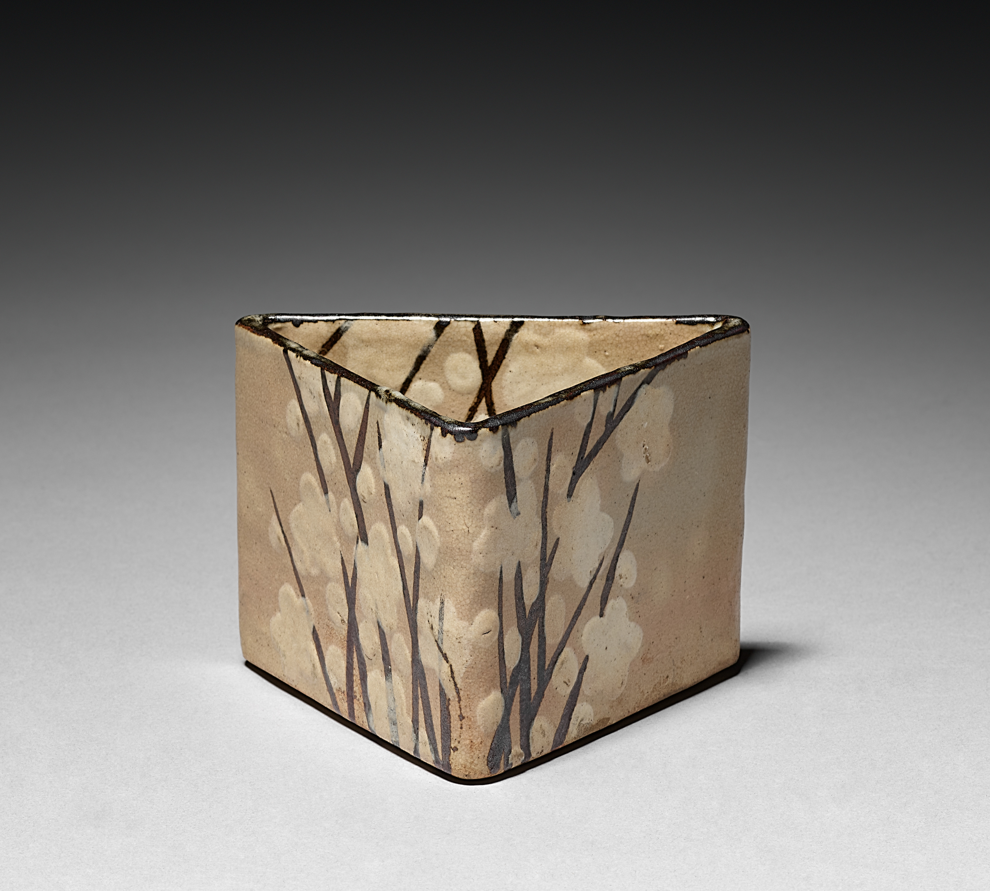 Beige ceramic bowl with flat bottom and straight sides that form a square shape. Dark brown rim around the top. Exterior features a design of dark brown tree branches with clusters of white flowers. Background fades from dark gray at the top to light gray at the bottom. Object casting a small shadow on the right.