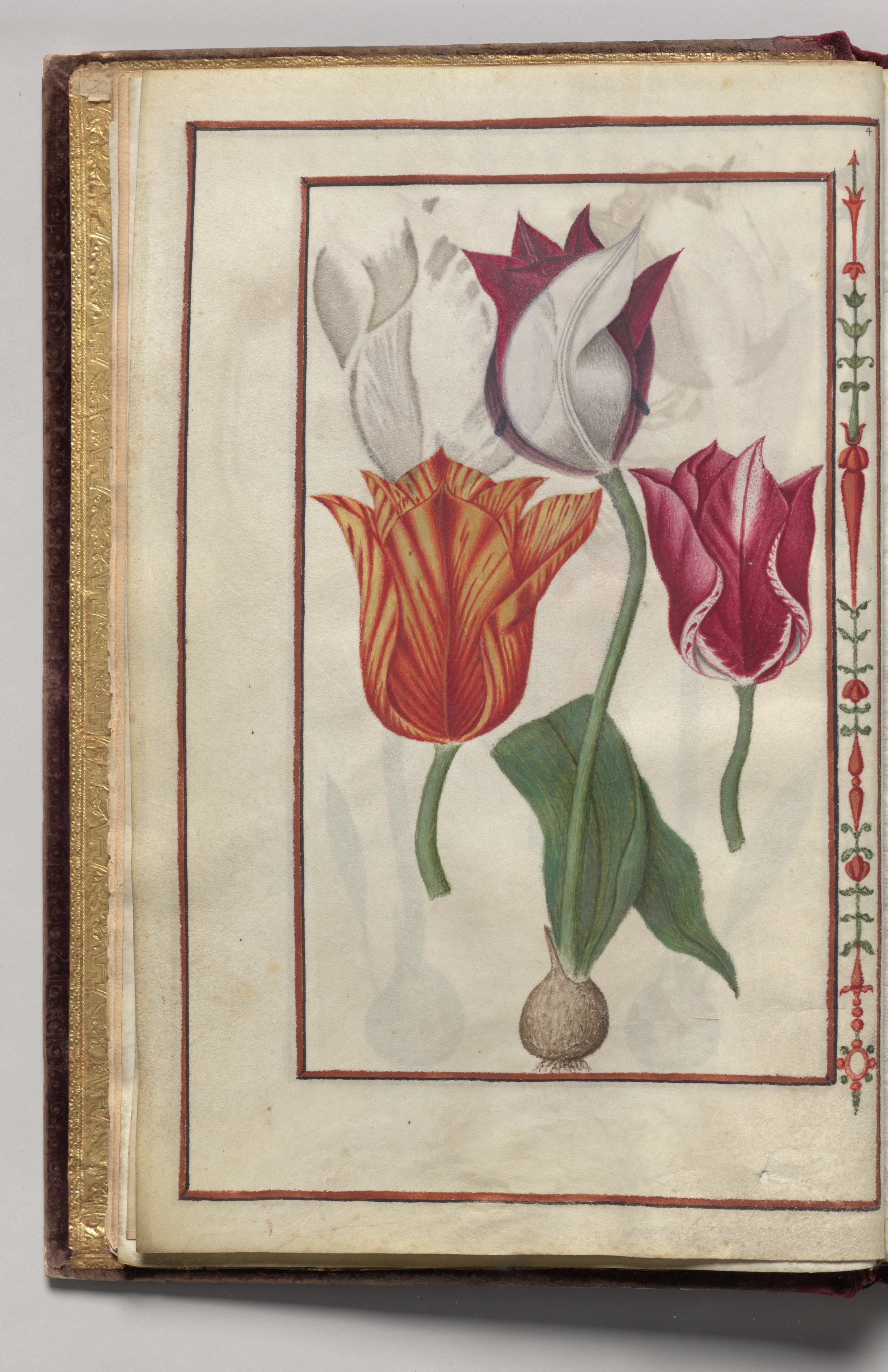 The image shows a book with an illustration of three tulips on the verso of a folio. The book has a dark red cover with a gold edge on the left side. The illustration is on a beige background with a thin red border and a thicker red border around it. The flowers are drawn in a realistic style with green stems and leaves. The tulip on the left is red and yellow, the one on the right is dark pink, and the one at the top is white and dark pink. The bulb of the flower is visible at the bottom. There is a decorative red, white, and green border on the right side of the illustration. The background of the image is gray.