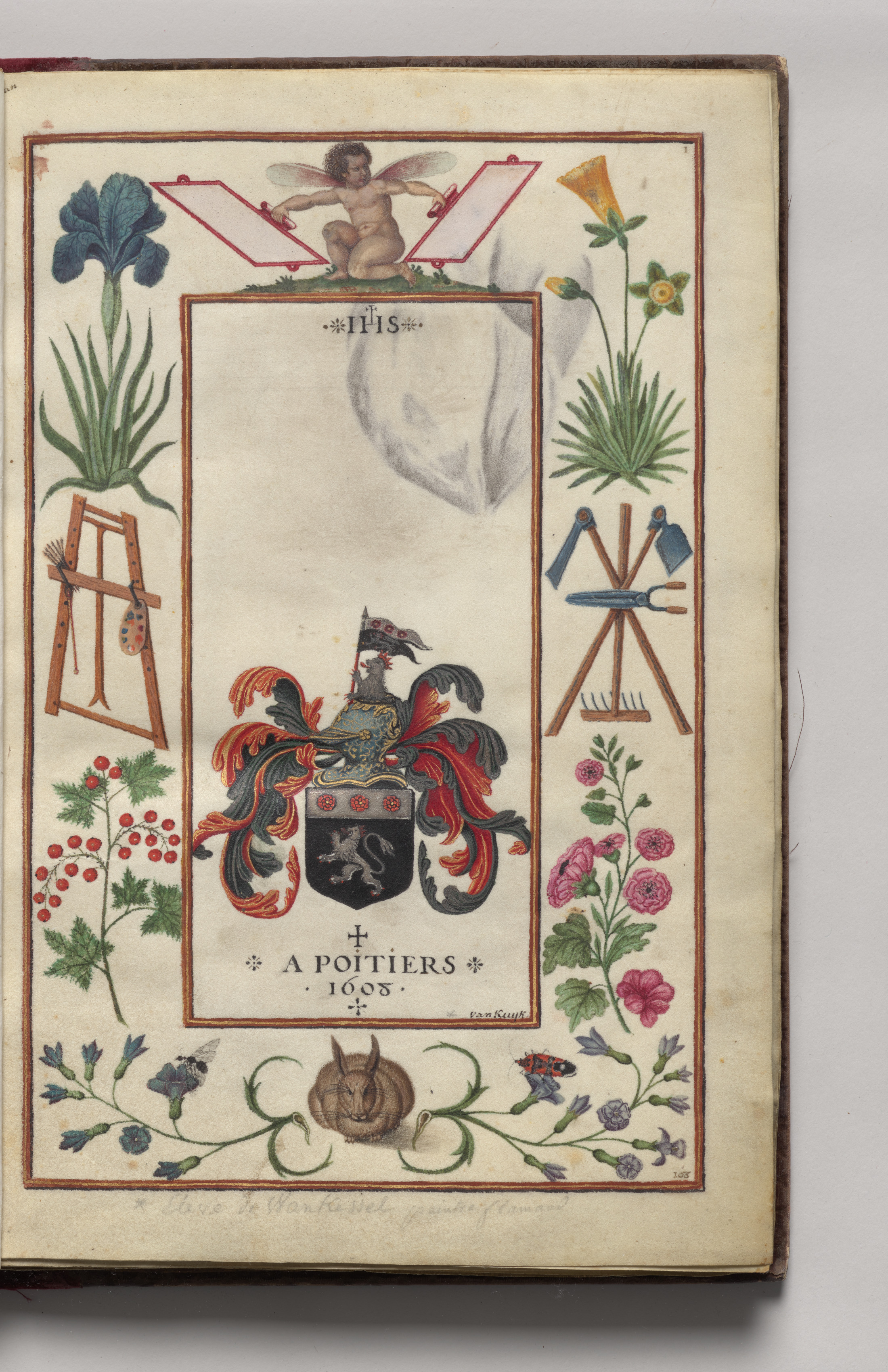 The image is the title page of a book with a coat of arms and a border of gardening tools, flowers, and foliage. The title page has a large rectangular border around the edge. Inside the border at the top is a cherub with wings and a grassy base. The cherub holds two white banners. Below the cherub, a large rectangle contains a coat of arms with a black shield featuring a lion. The shield features colorful feathers on either side and a helmet on top. Underneath the shield are the words "A POITIERS 1605". At the bottom of the page, a brown crest is surrounded by green vines and flowers. The border around the edge of the title page features various gardening tools, including a rake, shovel, and hoe. There are also several types of flowers and foliage, including irises and narcissus. The background of the title page is off-white.
