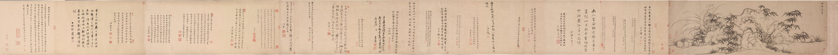 A long scroll painting, titled Bamboo, Rocks and Lonely Orchids by Zhao Mengfu, depicting a simple landscape. The scroll features a drawing of bamboo and several plants on beige paper. The drawing appears to be done with black ink. The plants are sparse and scattered with several rocks. The artist's drawing style is simple and elegant with delicate lines. A large blank white space occupies the center of the composition, taking up the majority of the scroll's surface. The remainder of the scroll contains black and red writing in a foreign script.