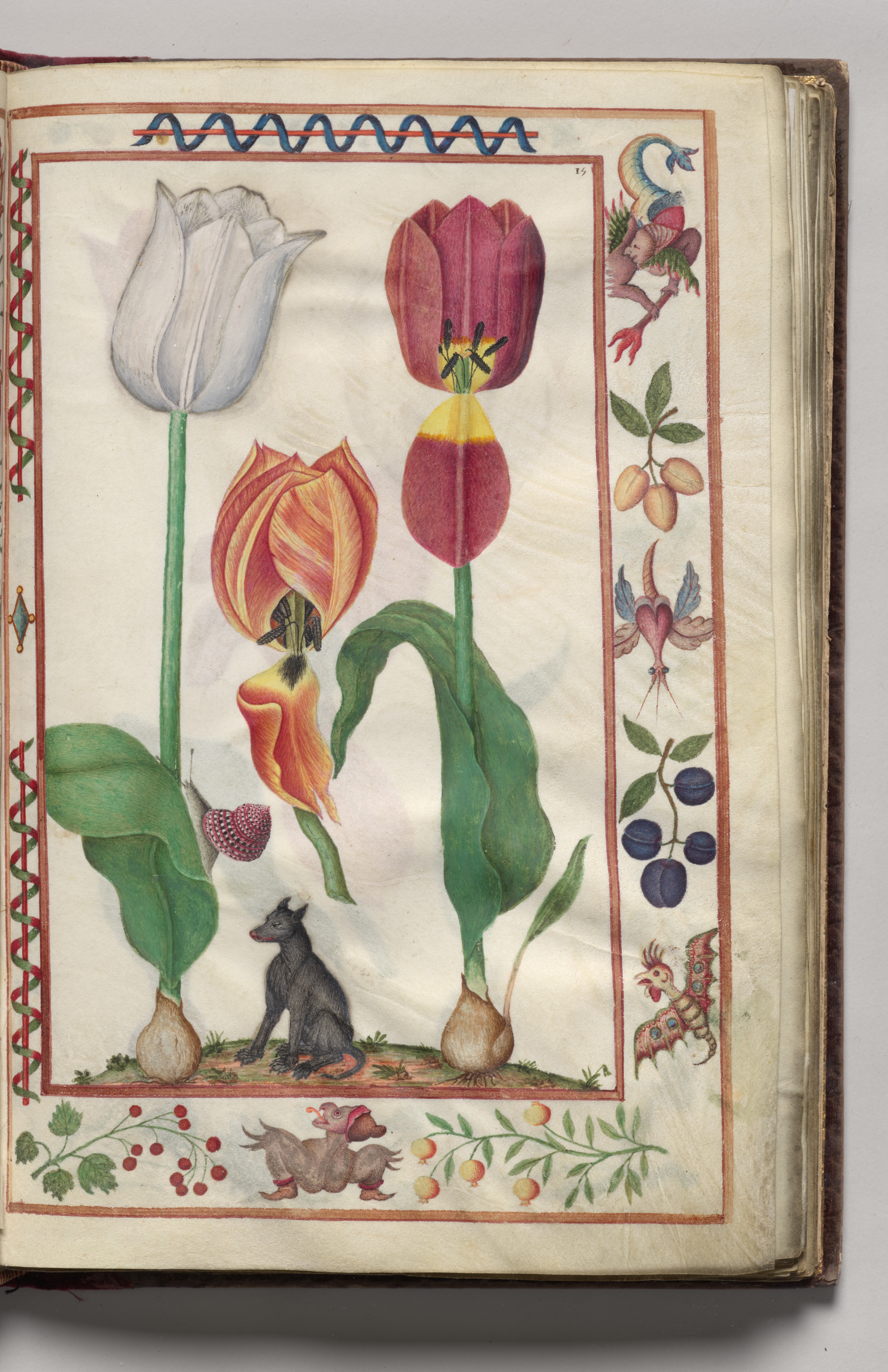 Tulips, Snail, and Dog with Hybrid Creature Border, folio 8 (recto), from Florilegium (A Book of Flower Studies)