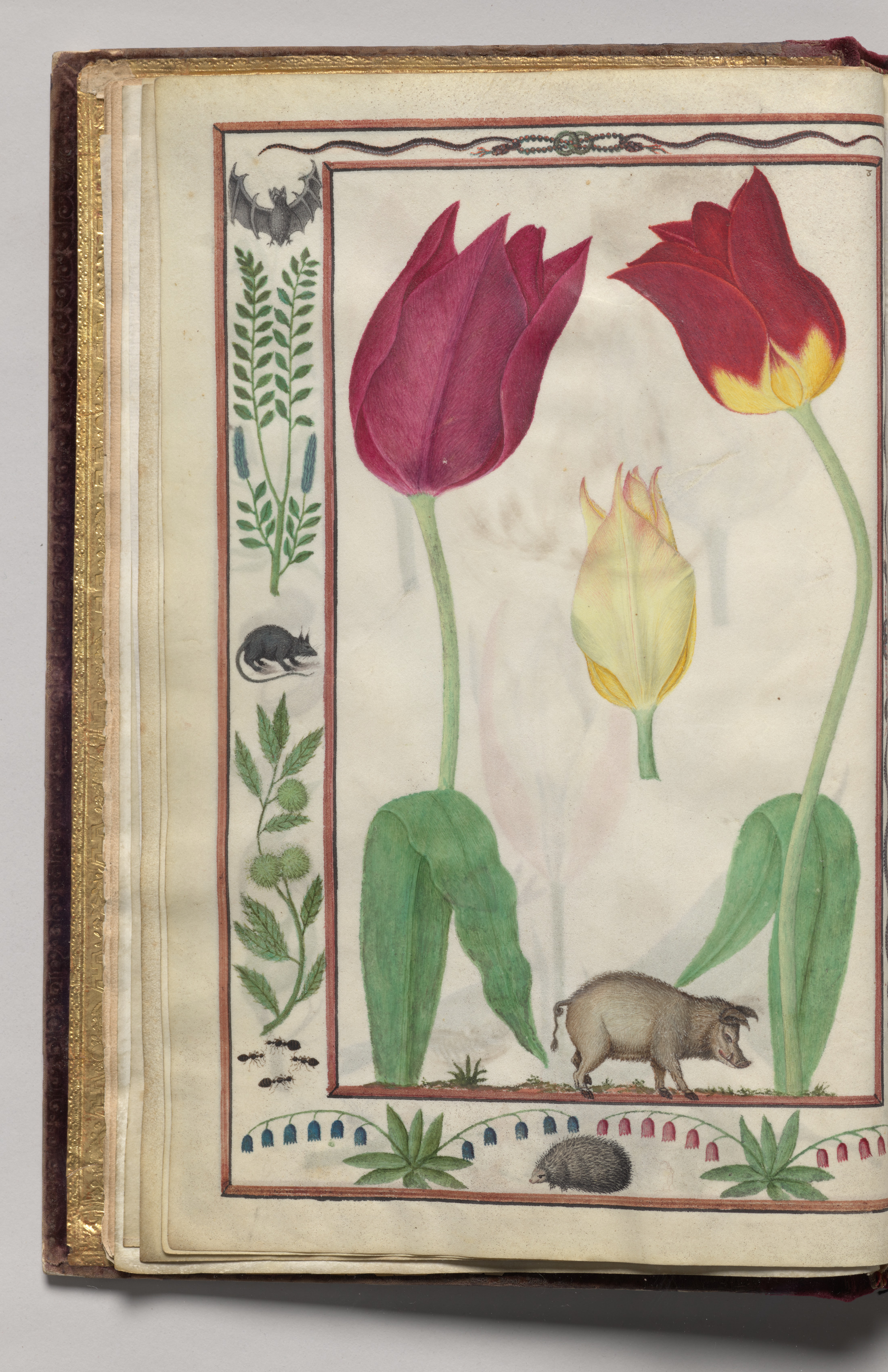 Tulips and boar with bat, snake, rat, and ants border. The image shows a book with an illustration of three tulips, a boar, a hedgehog, a bat, a rat, and ants. The tulips are in the center of the image, two are red and one is yellow. The boar is below the tulips and the hedgehog is below the boar. A border on the left side of the image contains a bat at the top, a plant below the bat, another plant below that, and a rat below the second plant. A border at the bottom of the image contains ants and plants. The background of the illustration is off-white. The book has a gold edge and a brown cover.