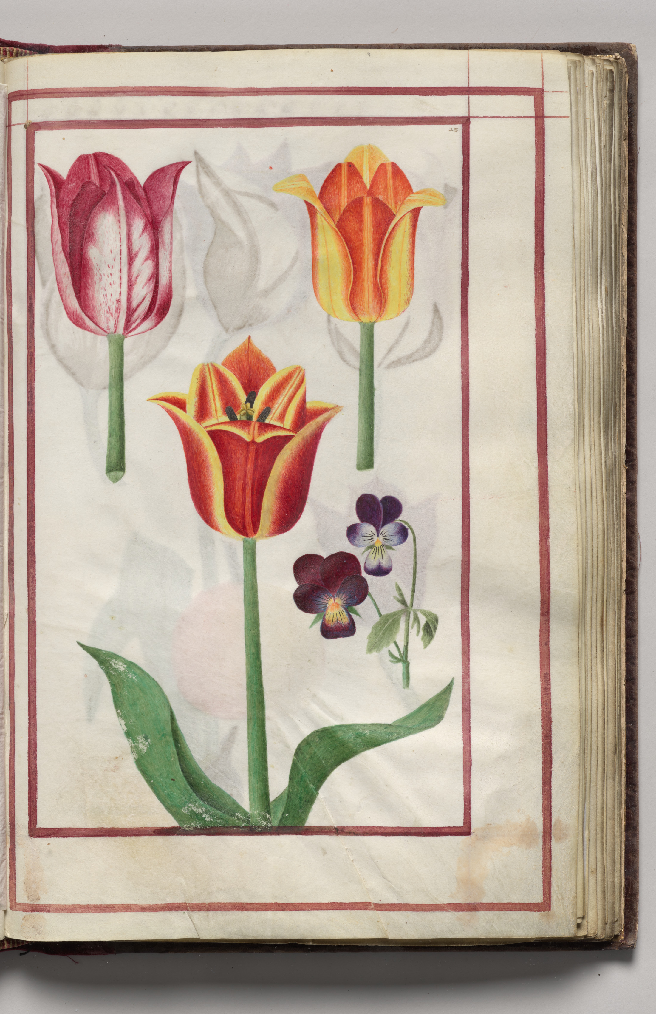 Open book with yellowed pages. Red border surrounds drawing on left page. Drawing depicts four tulips and two violets. Tulips are pink, orange and yellow, and red and yellow. Two tulips have green stems; one tulip has white outline. Two purple and yellow violets have green stems. Green leaves at base of tulips. Background of drawing is white with light gray shapes. Red border around drawing slightly darker than lines within. Dark brown book cover. Gray background.