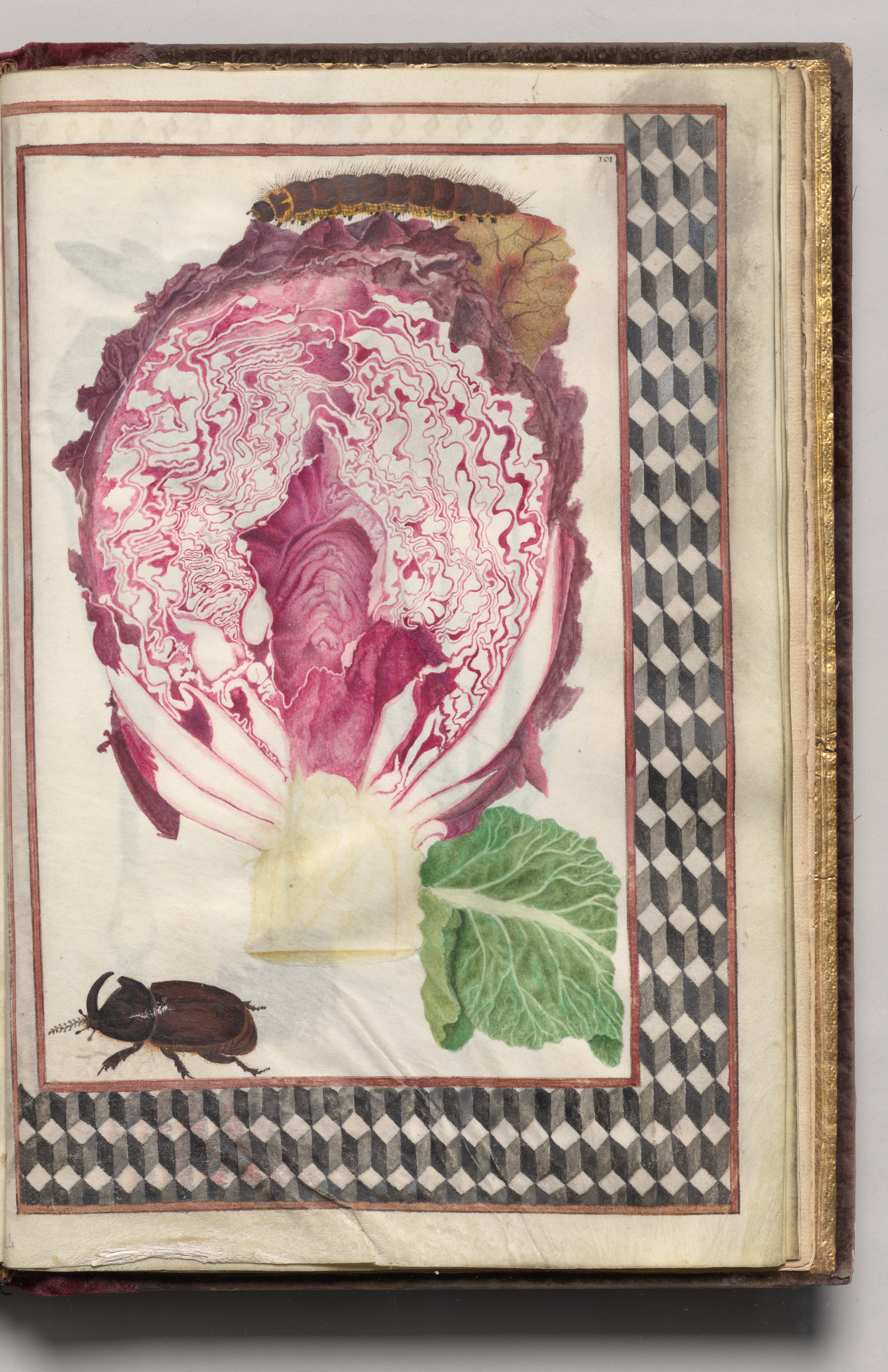 Cross Section of a Red Cabbage with a Beetle and Caterpillar with Geometric Border, folio 45 (recto), from Florilegium (A Book of Flower Studies)