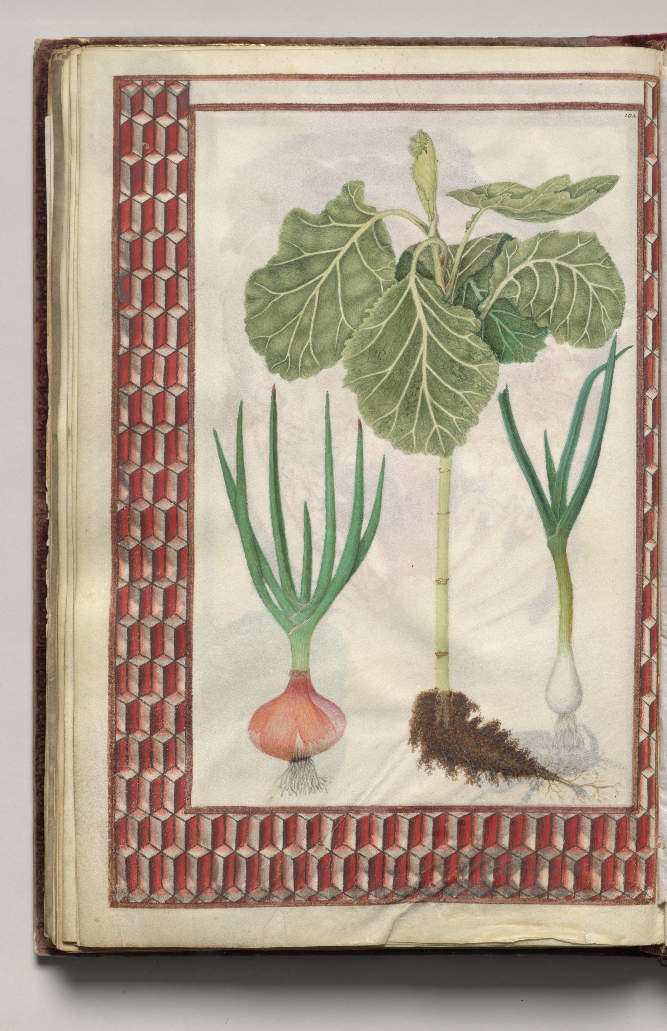 The image shows an open book with an illustration of vegetables on the right page. The page has a red and tan geometric patterned border around the illustration. The illustration depicts a cabbage plant with large green leaves and a thick stem, and two onion plants, one with a red bulb and the other with a white bulb. The onions have long green stems with roots at the bottom. The background of the illustration is a light tan color with subtle darker splotches. The book's cover is brown leather, and the pages are yellowed with age. The book is set against a plain gray background.