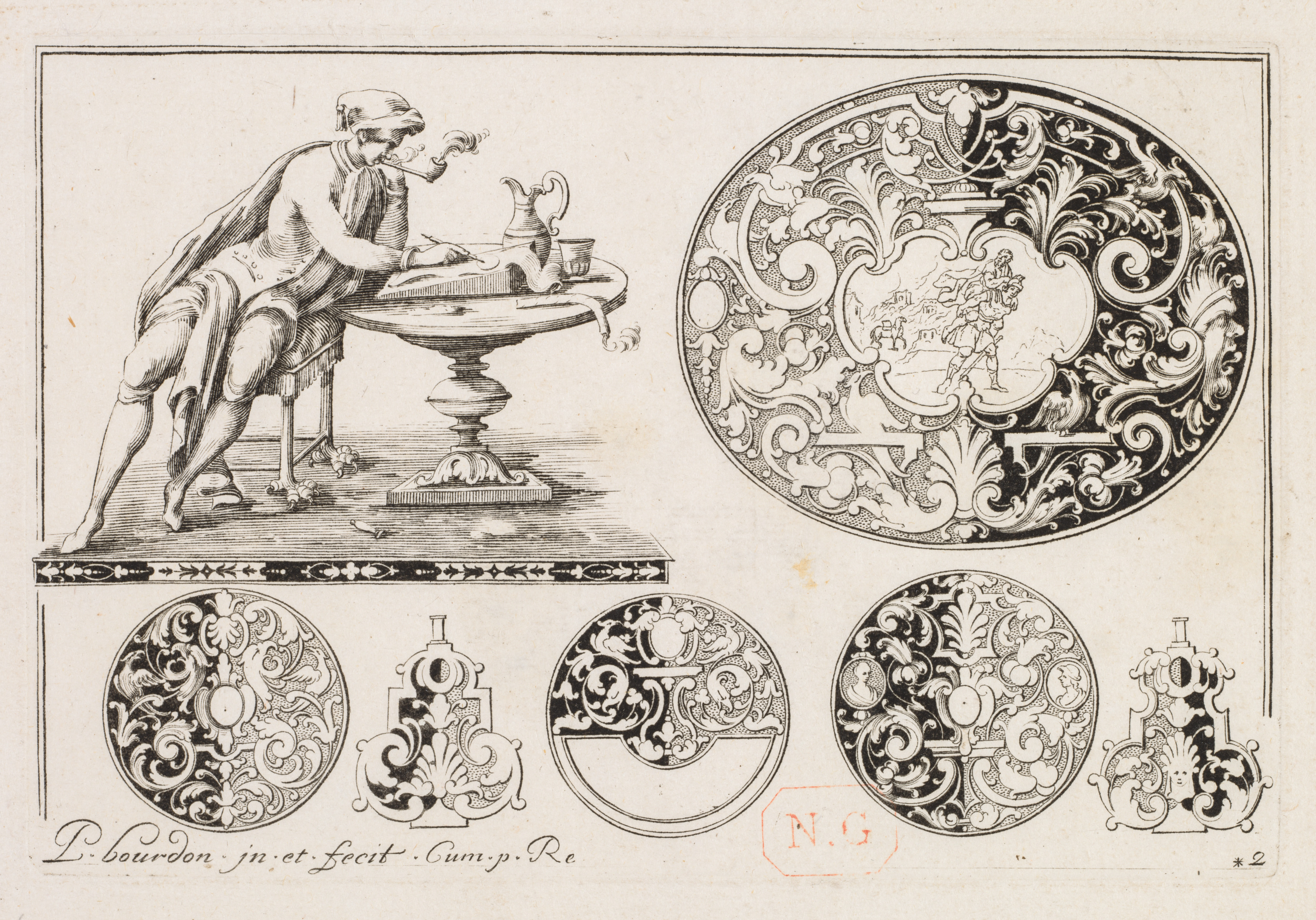 Black and white illustration on beige background. A man in 18th-century attire, with a hat, vest, and cape, leaning over a table, smoking a pipe, with a jug and a cup on the table. Under the table scene are four circular and two long, thin ornate designs. The large circular design to the right of the table scene features a central image surrounded by ornate swirling patterns. The smaller circular designs feature similar swirling patterns. The long, thin designs feature symmetrical ornate patterns. The artist's signature appears in cursive at the bottom left. The image is framed by a thin border.