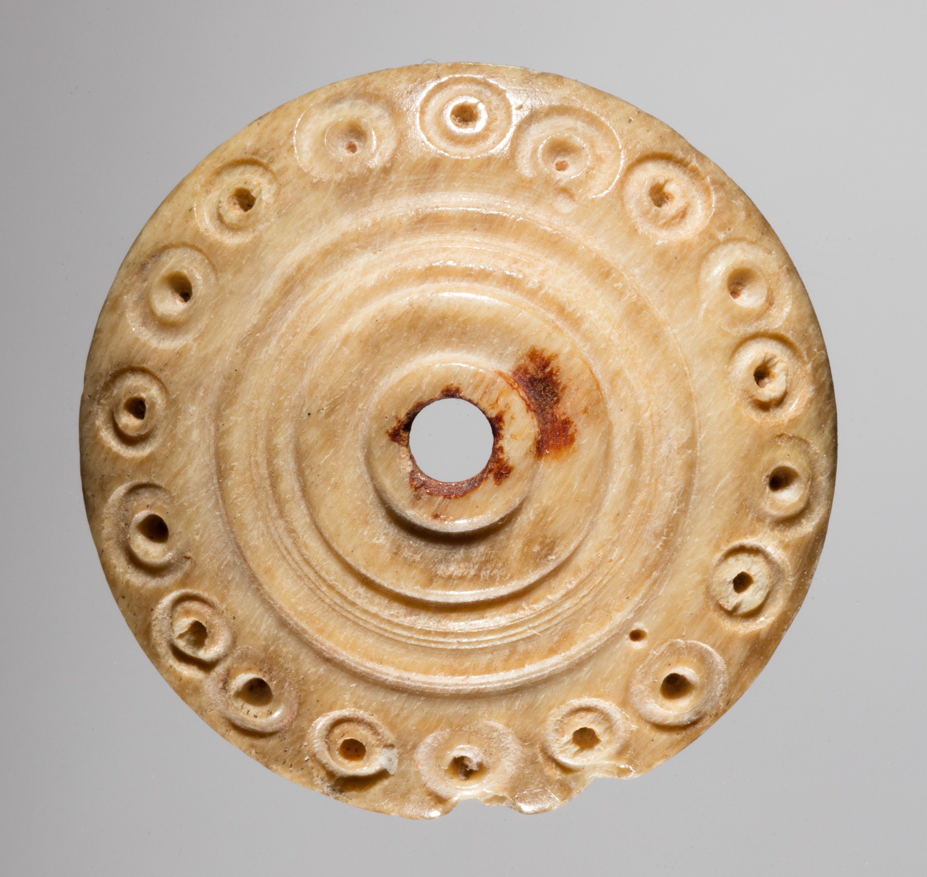 Spindle Whorl by Unknown. Circular, flat object with a hole in the center and smaller holes around the edge. The object is made of a light-colored material, possibly stone or bone. It has a smooth surface with concentric circular grooves. The central hole is surrounded by a rust-colored stain. The outer edge features a series of small circular depressions with holes in the center of each. The background is a plain gray color.