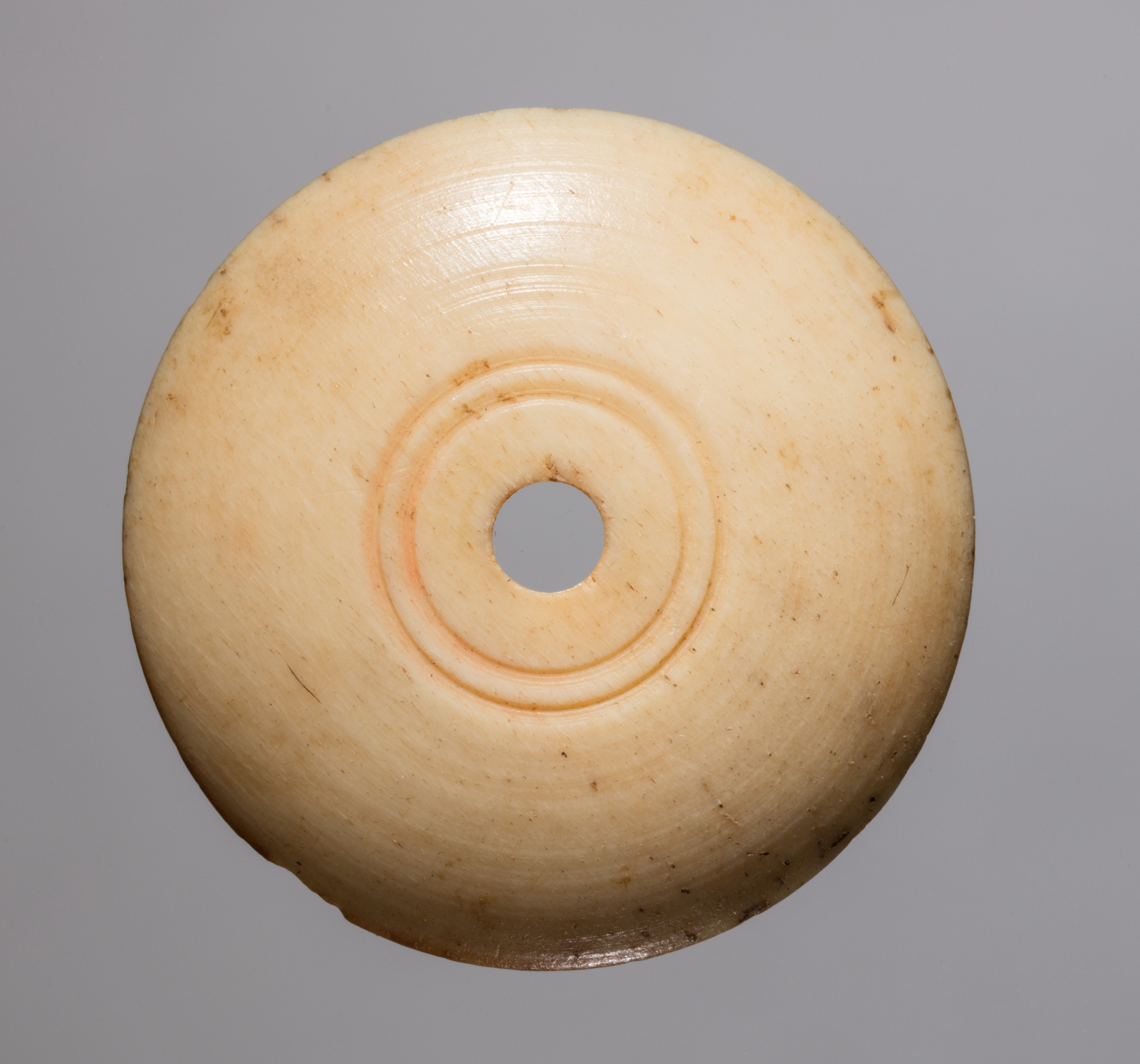 The object is a light-colored, circular spindle whorl. The spindle whorl has a hole in the center and two concentric circular grooves around it. The surface appears smooth and slightly shiny. The background is a solid gray color.