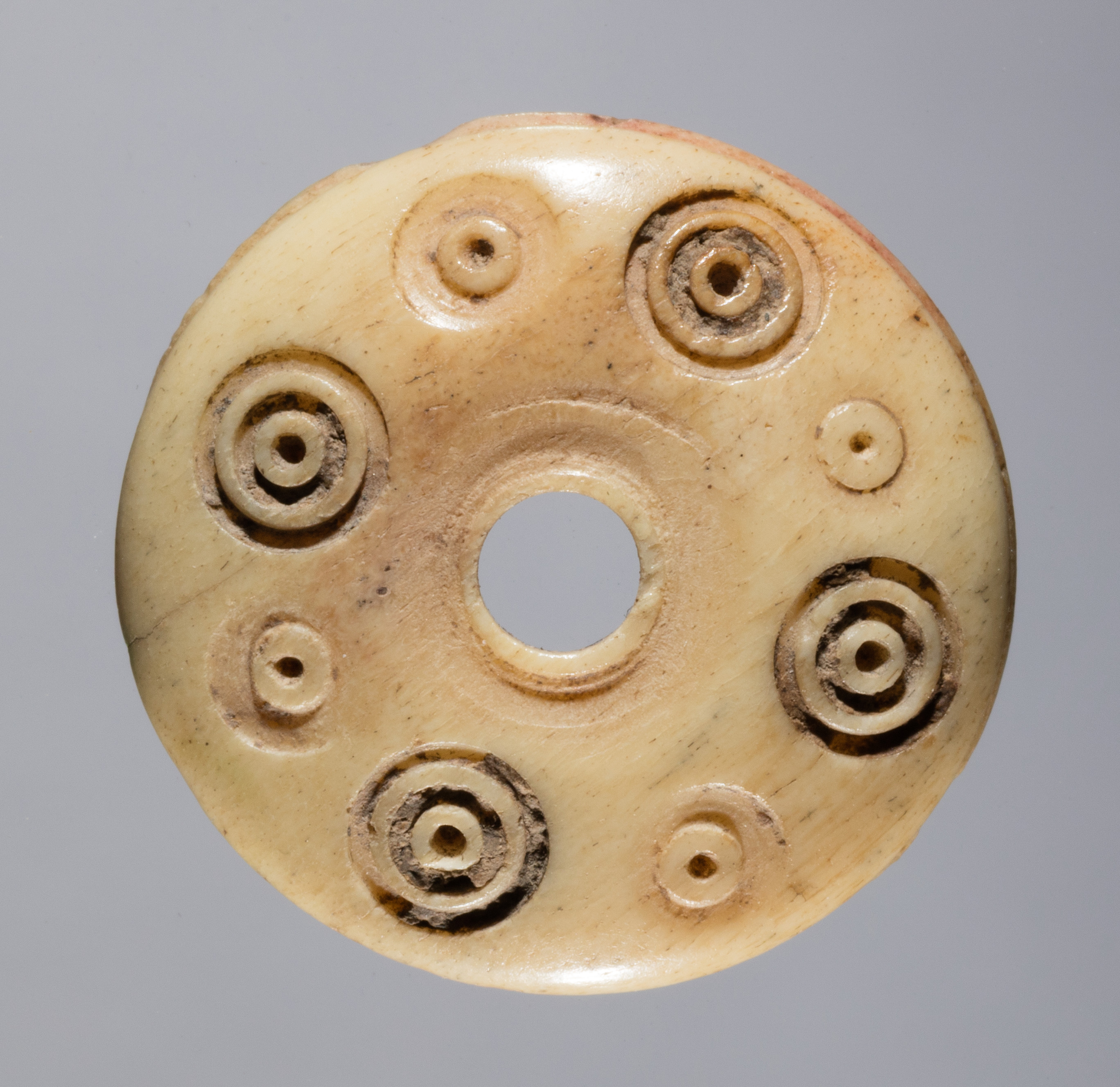 Round, flat, beige-colored object with a hole in the center. The object has a smooth surface and is made of stone or bone. It has a light brown color with darker brown spots. There are eight circular indentations around the central hole, each with a smaller hole in the center. The indentations are arranged in a symmetrical pattern. The background is gray. Title: Spindle Whorl, Artist unknown.