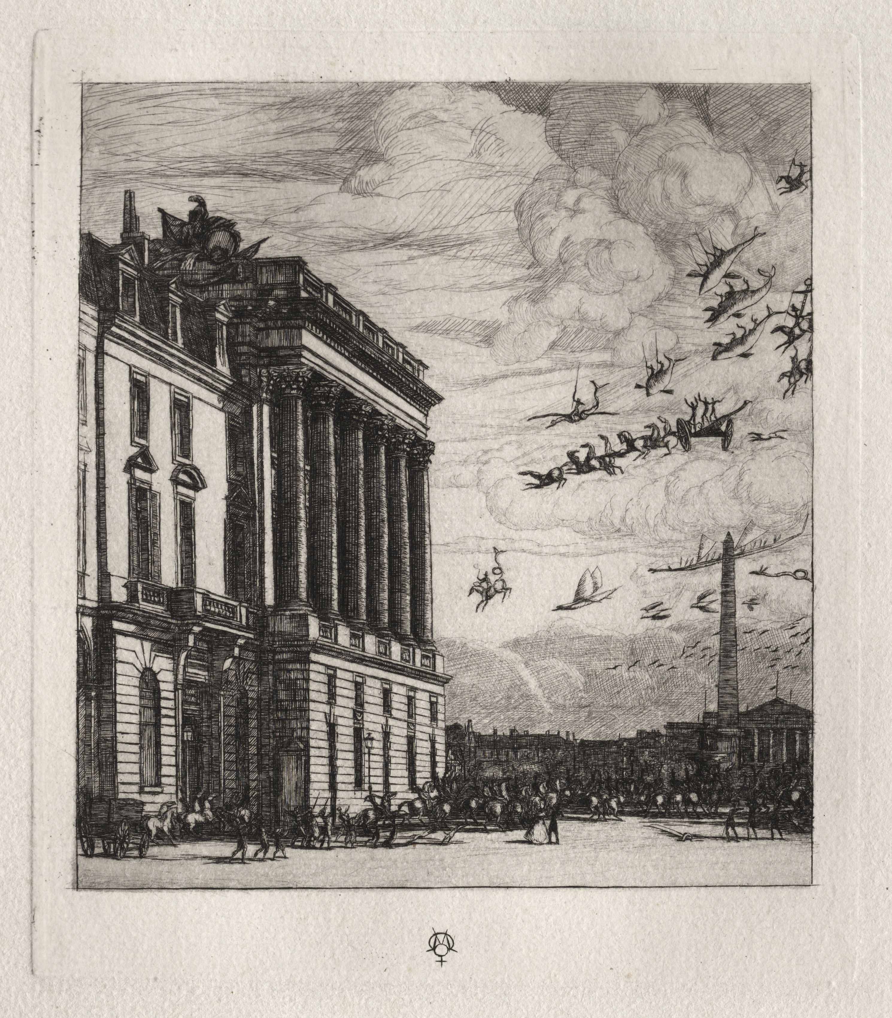 The Admiralty, Paris by Charles Meryon: A black-and-white etching of a large building with columns on the left and an obelisk in the distance on the right. The building has three floors with many windows. People and horse-drawn carriages are on the street in front. The sky has clouds and flying figures.