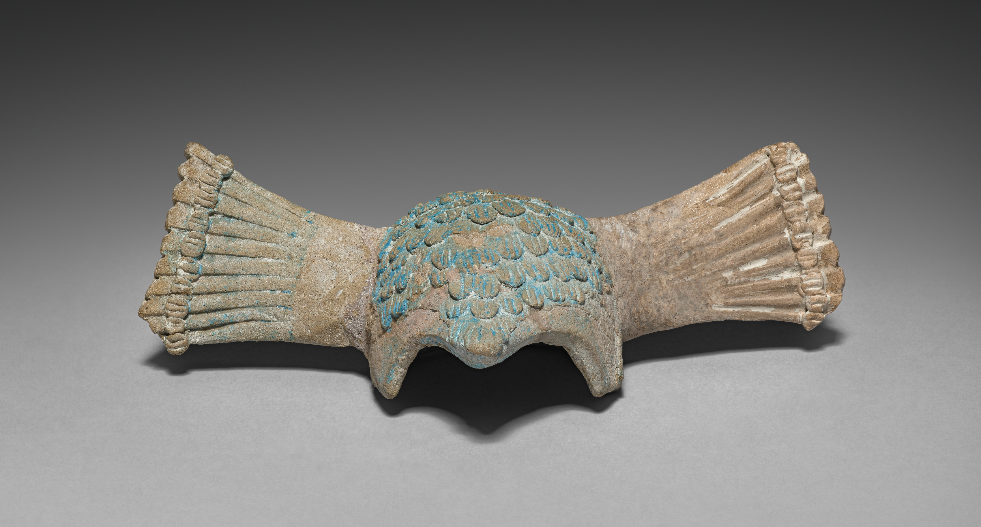 The object is a bronze headdress with a patina. The main body of the headdress is rounded and features a scale-like design with turquoise-colored accents. Two extensions protrude from the sides, each resembling a feather or wing with a ribbed texture and scalloped edges. The background of the image is a gradient transitioning from dark gray at the top to light gray at the bottom.