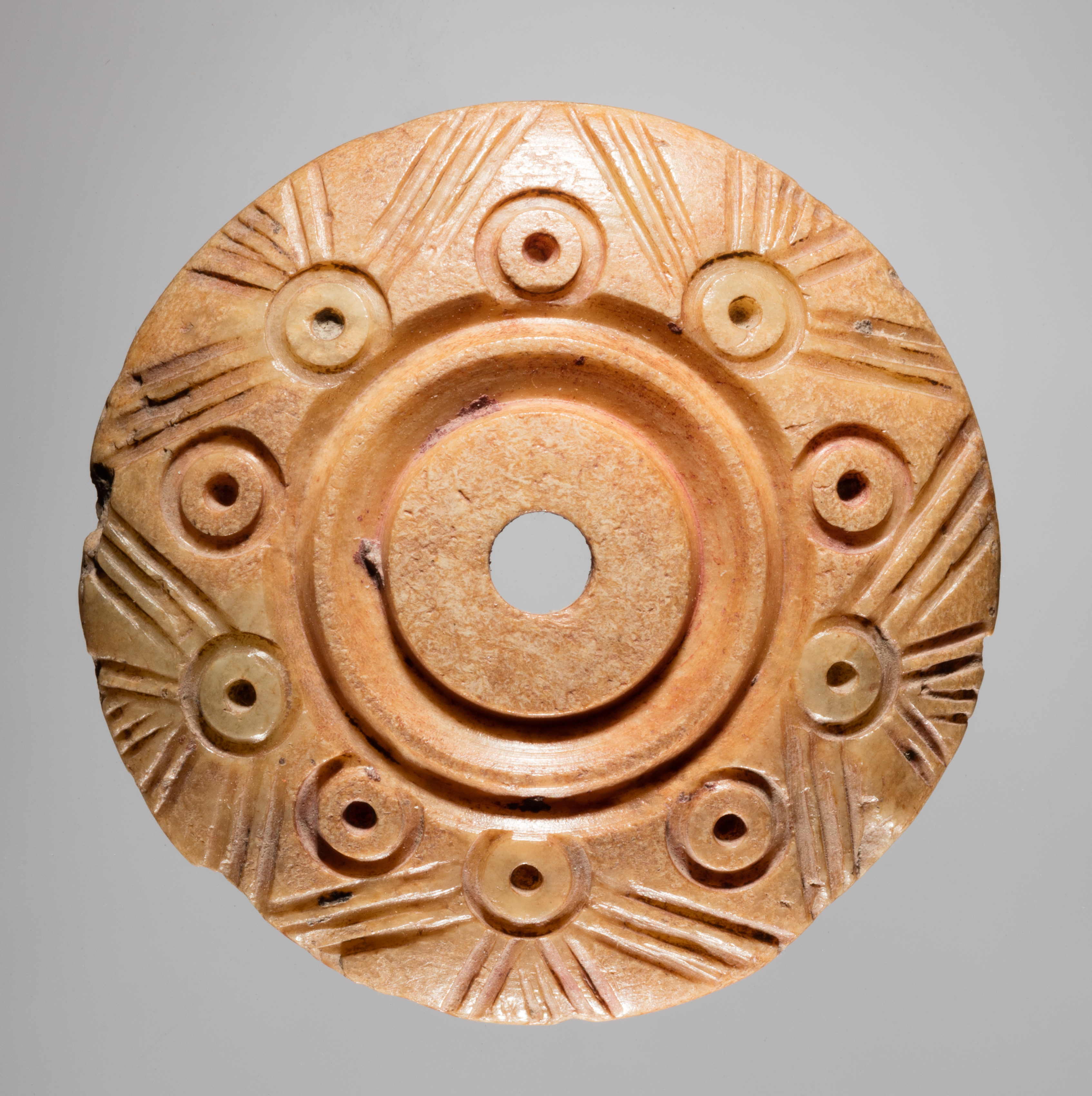 Spindle Whorl by Unknown. Round, flat object with a hole in the center and several smaller holes around the edge. The object is made of a light-colored stone or ceramic material. It has a raised circular pattern around the central hole and a series of lines radiating from the center. There are eight smaller circular indentations around the edge, each with a small hole in the center. The background of the image is gray.