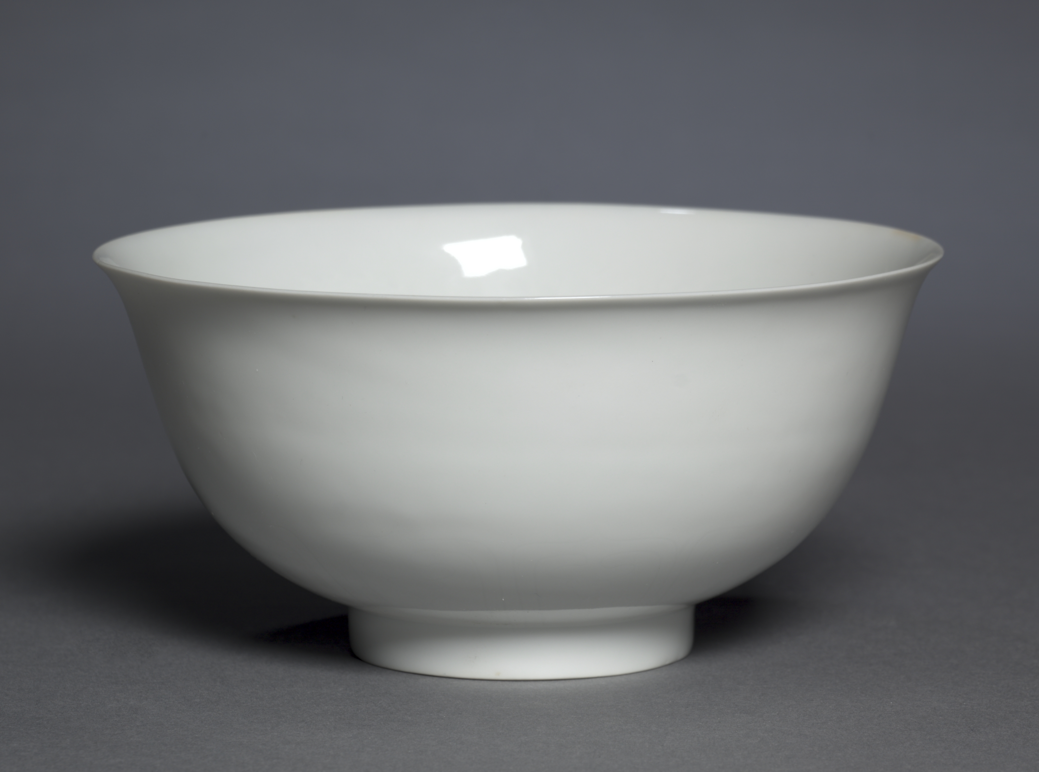 Bowl with Dragons and Clouds, a white porcelain bowl with a wide mouth and a narrow base, is depicted. The bowl's exterior and interior are smooth and glossy. It has no visible patterns or designs on the visible surface. The bowl is positioned on a gray surface against a gray background.