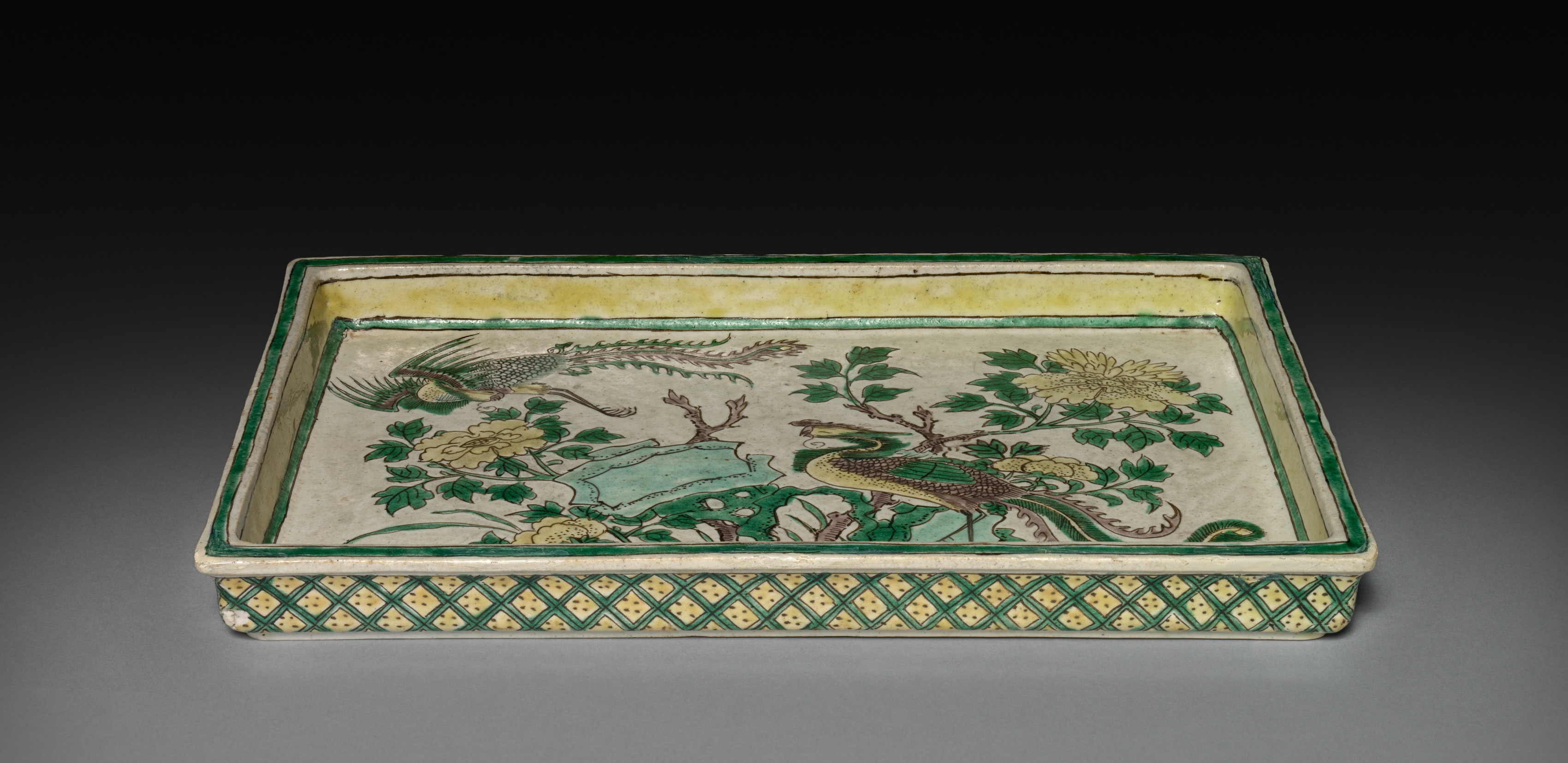 The rectangular tray has a flat bottom and slightly raised edges. The interior of the tray is yellow. The exterior base color is white with green border. The tray features two phoenixes in a landscape design. The phoenix on the left side is green with a long tail and the one on the right side is green and gold with a short tail. They are surrounded by green leaves and yellow flowers. The bottom edge of the tray has a repeating green and gold diamond pattern. The background of the image is dark gray to black gradient.
