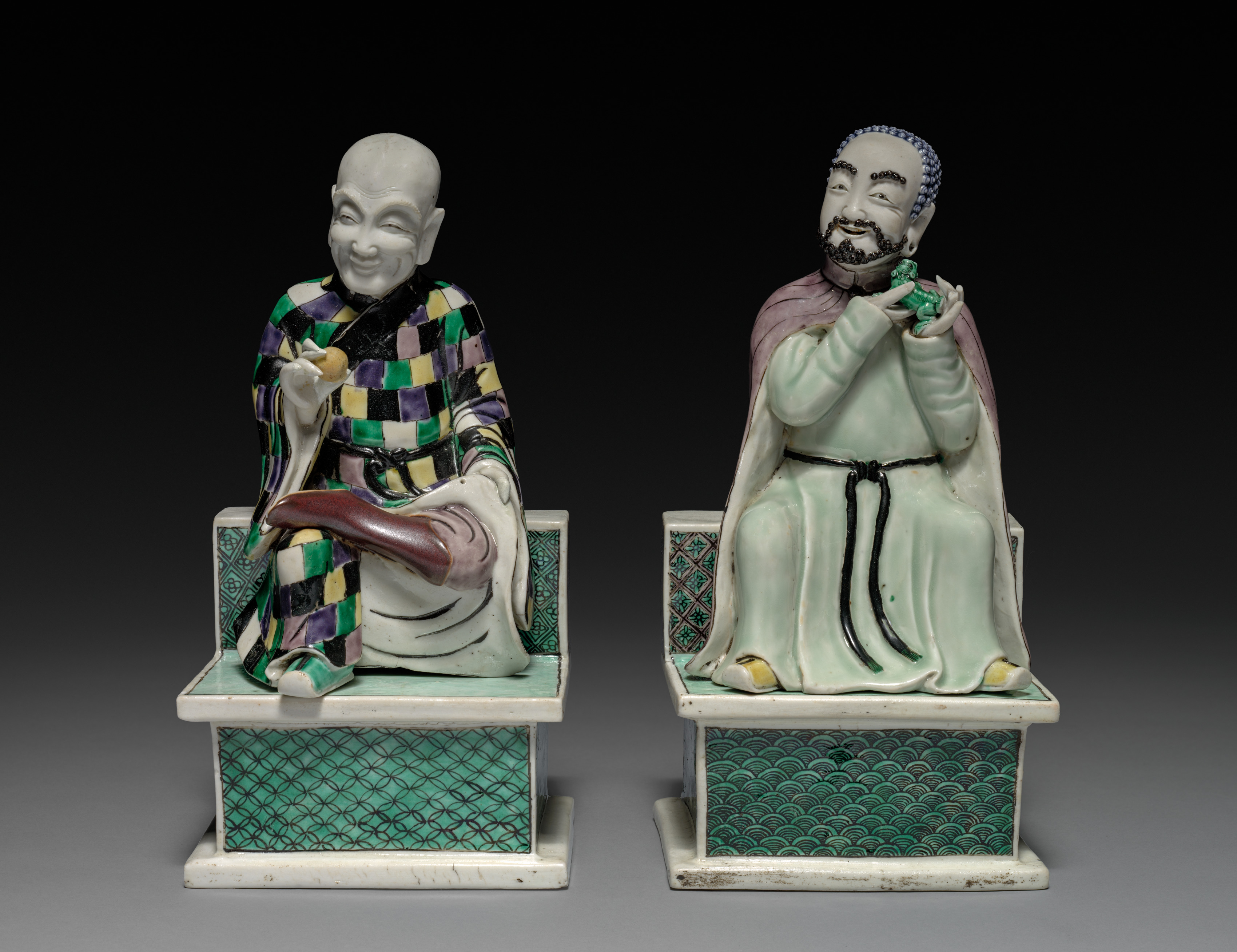 Two ceramic statues of men sitting on thrones. The statue on the left is bald, has a large smile on his face, and is wearing a multicolored robe. He has his right hand resting on his knee and his left hand holding a peach. The statue on the right has a beard and a blue headband. He has a pink cape over his shoulders and is wearing a green robe. He is holding a green object to his face with both hands. Both statues are sitting on white thrones with green accents. The background is black.