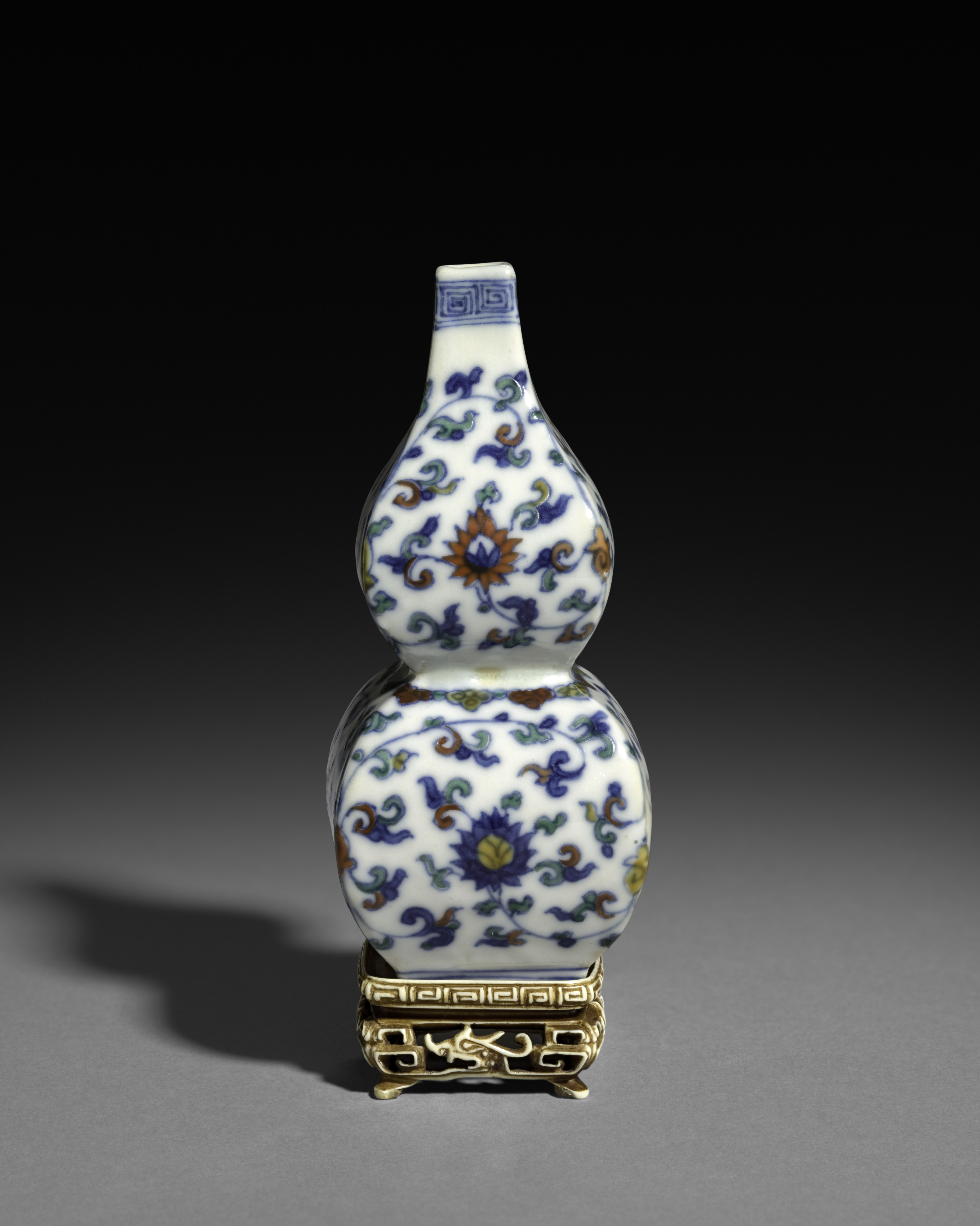 Square double-gourd vase with floral scrolls by artist. The vase is white with blue, green, and brown floral patterns. It has a narrow neck and a wide body that is shaped like two connected gourds. The vase stands on a gold-colored stand with a Greek key design. The base of the vase and the stand have a Greek key pattern. The background is dark gray to black, with a shadow cast to the left. The vase is square-shaped overall.