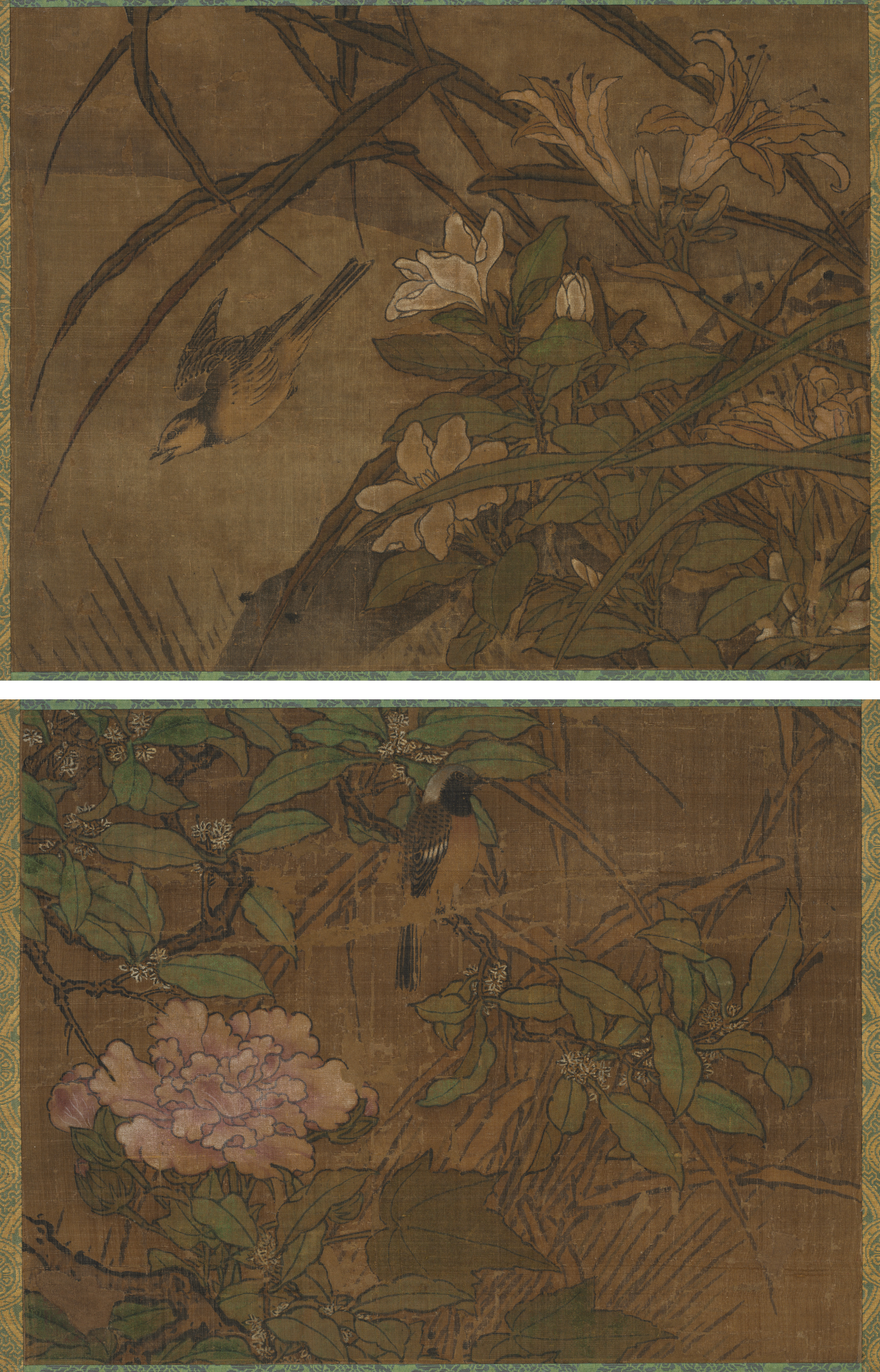 The image depicts two sections of a painting. The top section shows a bird flying towards the left, surrounded by several branches with green leaves and white flowers. The background of this section is brown. A thin green and gold border surrounds the painting. The bottom section shows another bird on a branch, surrounded by green leaves and flowers, one of which is pink. The background of this section is also brown. A thin green and gold border surrounds the painting. The paintings appear to be done in a traditional East Asian style, with bold lines and muted colors. The overall effect is one of serenity and natural beauty. The title of the painting is "Birds and Flowers" and the artist is Sesshū Tōyō.
