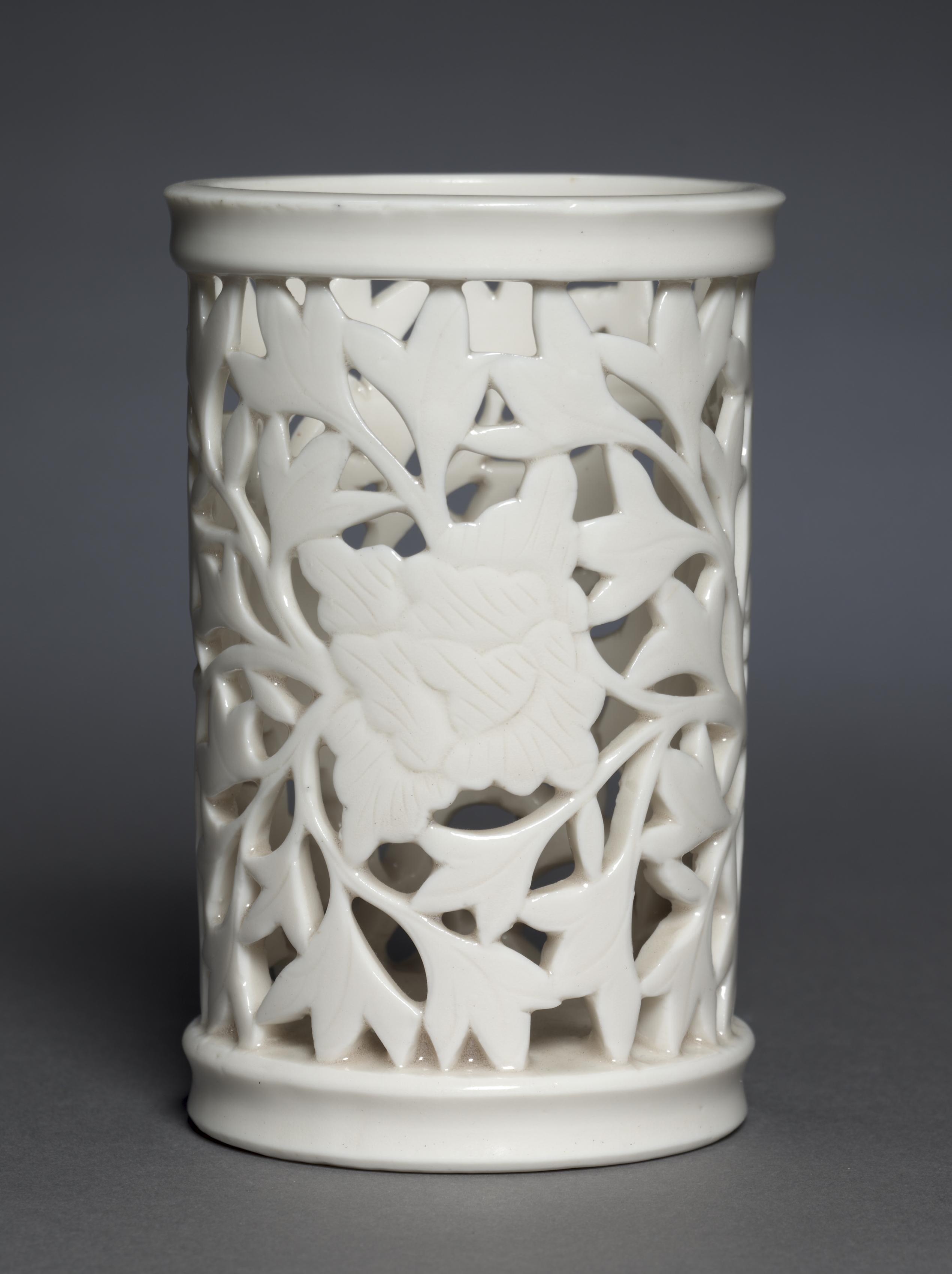 White ceramic brush pot with a cylindrical shape. The pot has an openwork design featuring peony flowers and leaves. The base and top are solid white, with a smooth glossy finish. The background of the image is gray.
