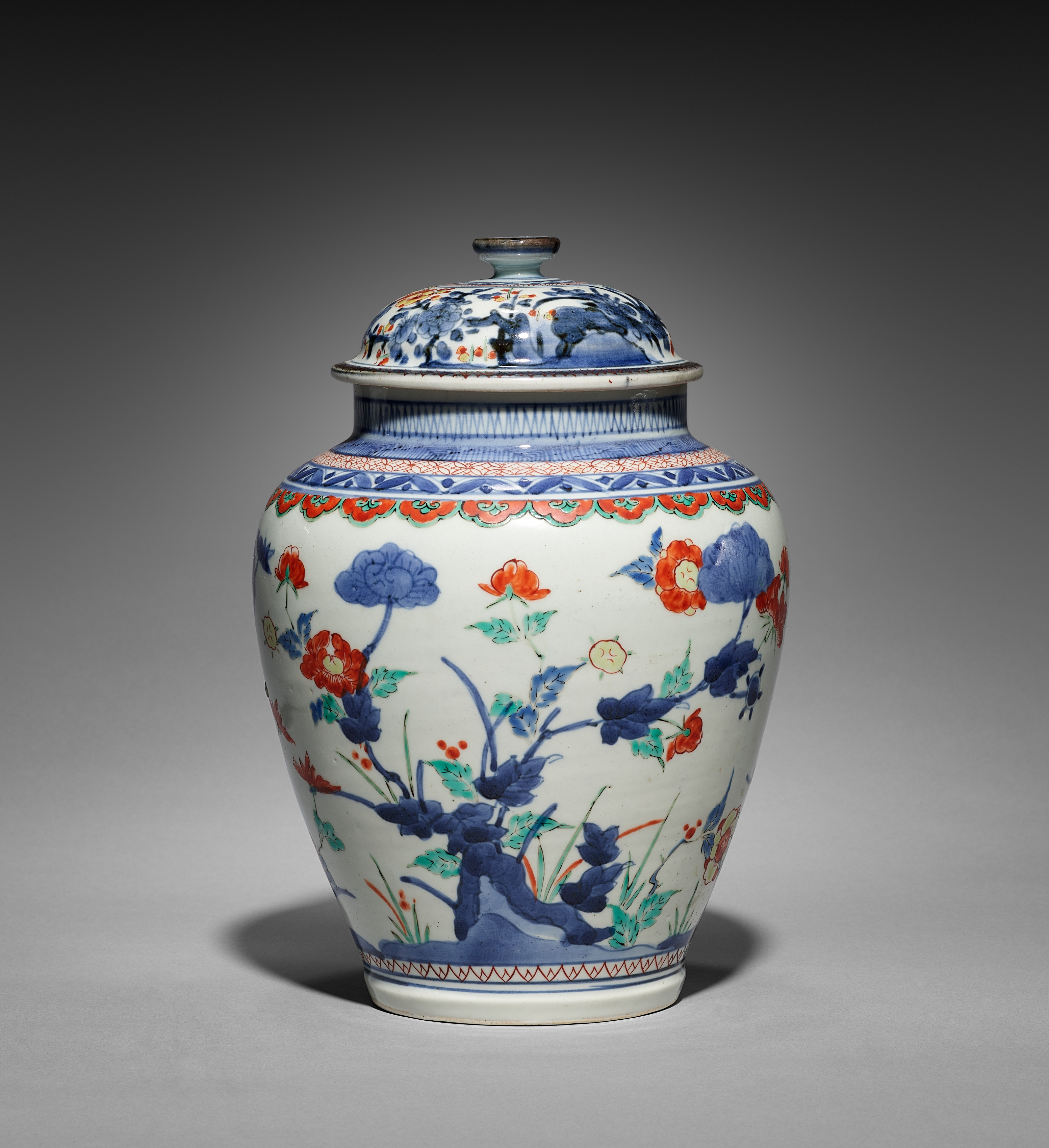 Covered Jar with Chrysanthemums, Peonies, and Plum