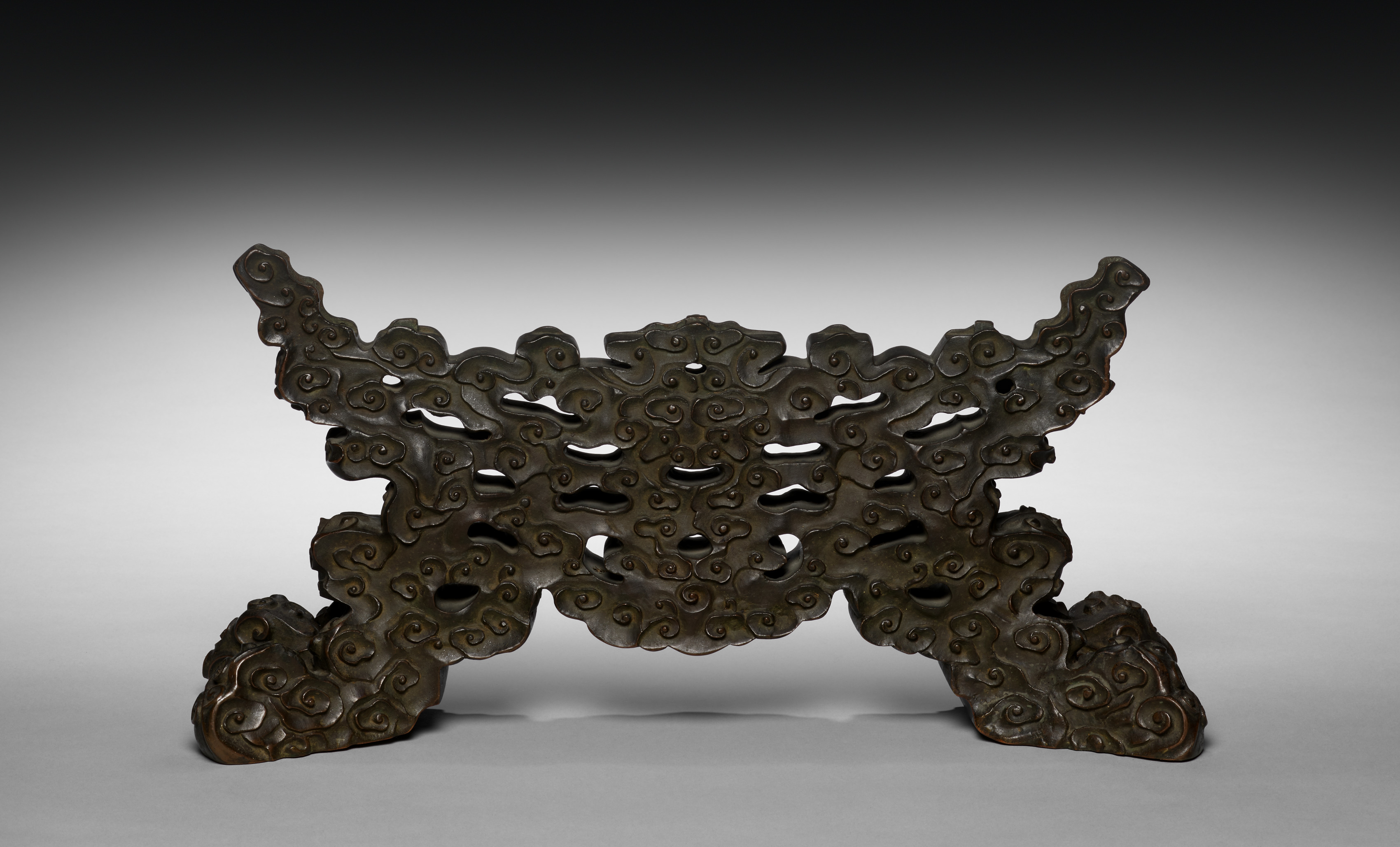 Dark bronze-colored object with a flat top and curved sides. The object has a decorative design on it. It has three legs. The design on the object resembles waves or clouds with curled ends. The object has a symmetrical shape, with the left and right sides being mirror images of each other. The top surface of the object is flat and has a short lip around the edge. The object appears to be made of metal, possibly bronze or brass, and has a dark patina. The background of the image is a gradient that goes from dark at the top to light at the bottom. The reverse side not shown in this image shows a landscape. The object is titled "Stand for Screen with European Figures".