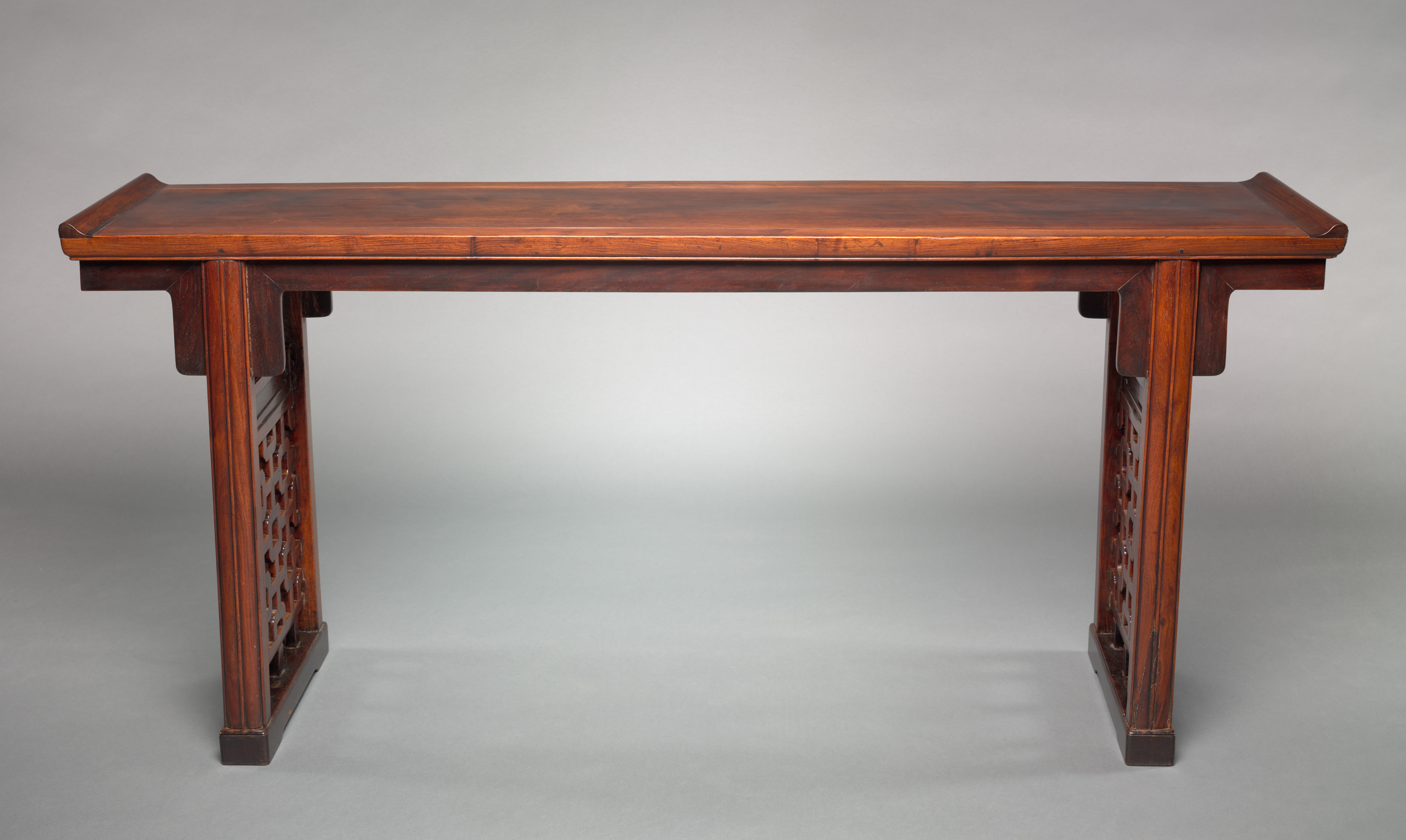 The image depicts Altar Table by artist, Kuo. The rectangular table features a flat top with curving corners on the short sides and slightly raised edges. The tabletop's surface exhibits a reddish-brown wood grain pattern. Two legs on either side are connected by rectangular blocks at the top and bottom. The legs are adorned with lattice-patterned carvings on the visible sides. The background consists of a gray surface and wall, with the table casting a subtle shadow.