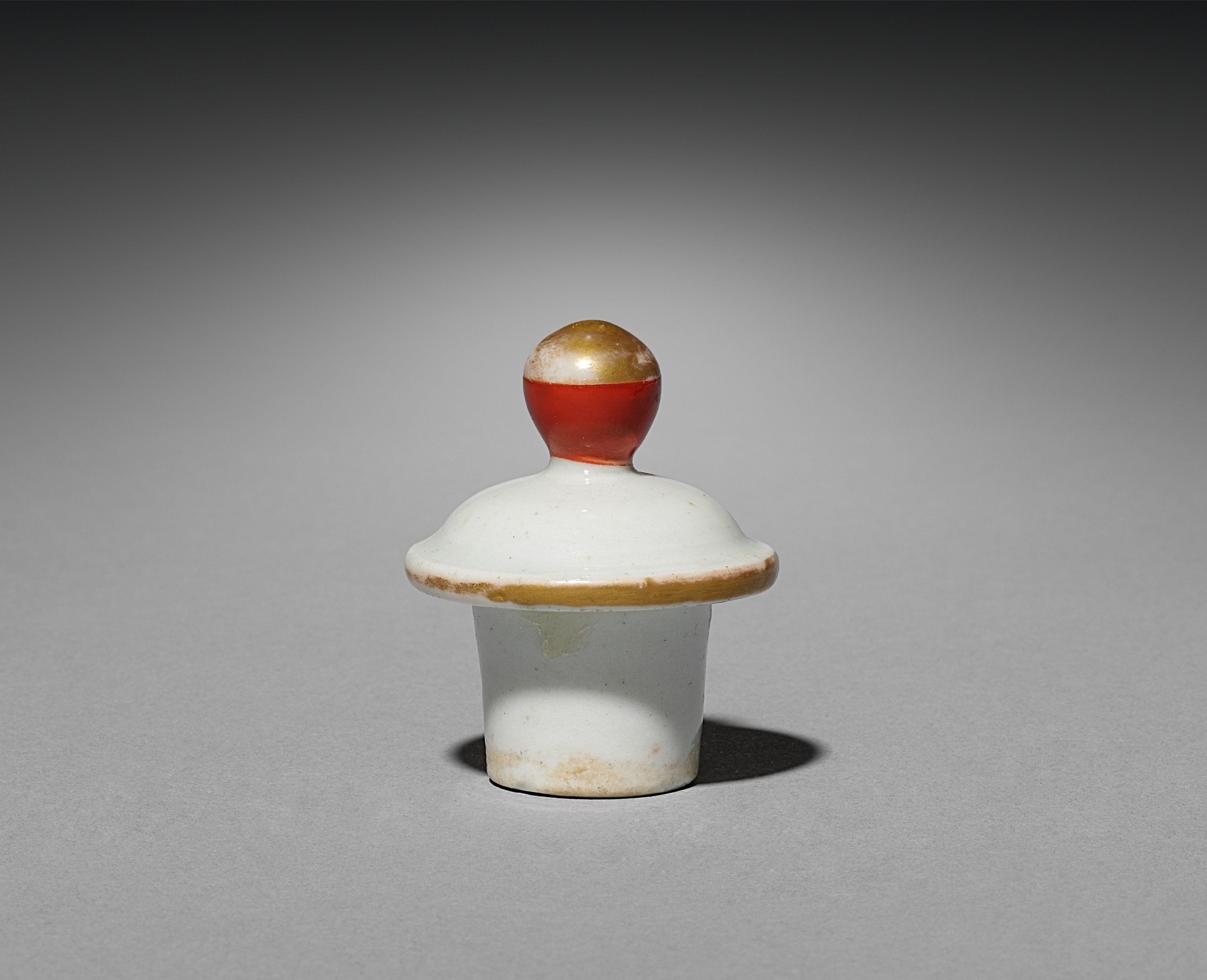 White ceramic lid with brown rim and red and gold knob on top; white cylindrical base with brown at bottom. The artist created Sake Bottle with Three Figures. The piece Sake Bottle with Three Figures (lid) shows a white cylindrical base, approximately one-third visible, with a small amount of brown around the bottom. A white, dome-shaped lid with a brown rim sits on top. The lid has a red stem and gold knob. The background is gray with a black vignette.