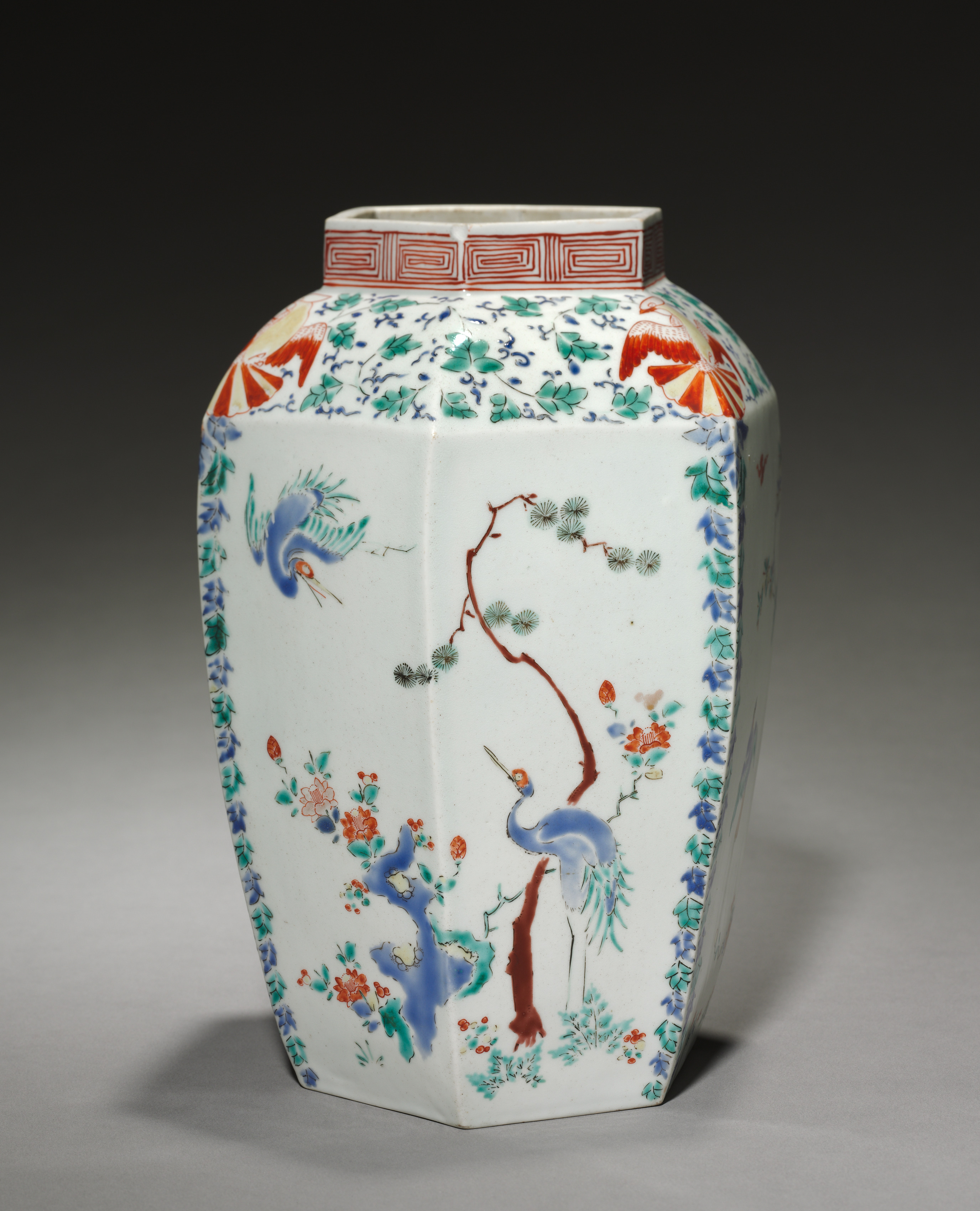 Hexagonal jar by artist. White ceramic hexagonal jar with a red and white patterned lid. The jar's body features a white background with a blue, green, and red design. Two blue cranes are depicted, one on a branch and the other flying. The jar has a blue and green border. The background is dark gray.