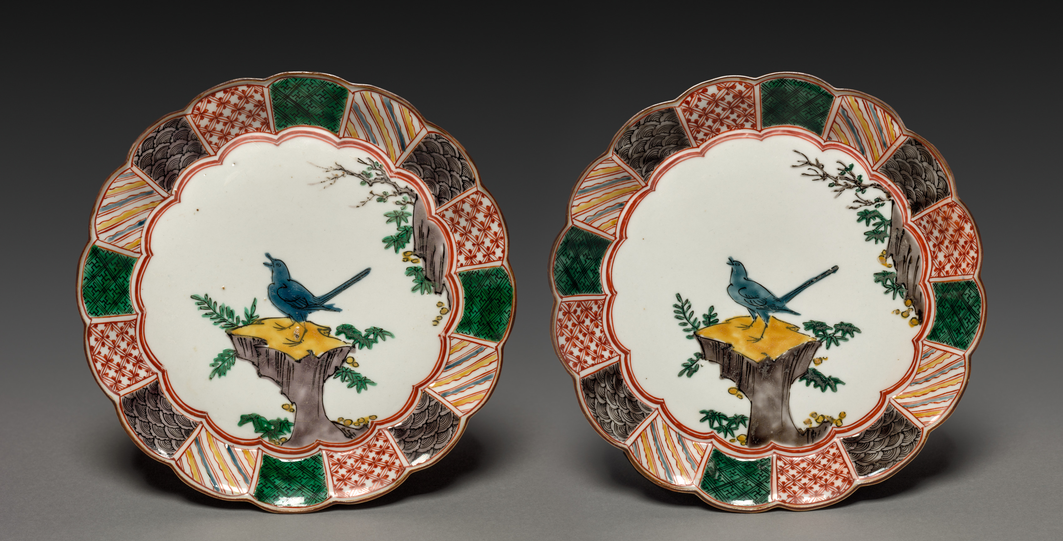 Pair of Dishes with Singing Bird on a Rock