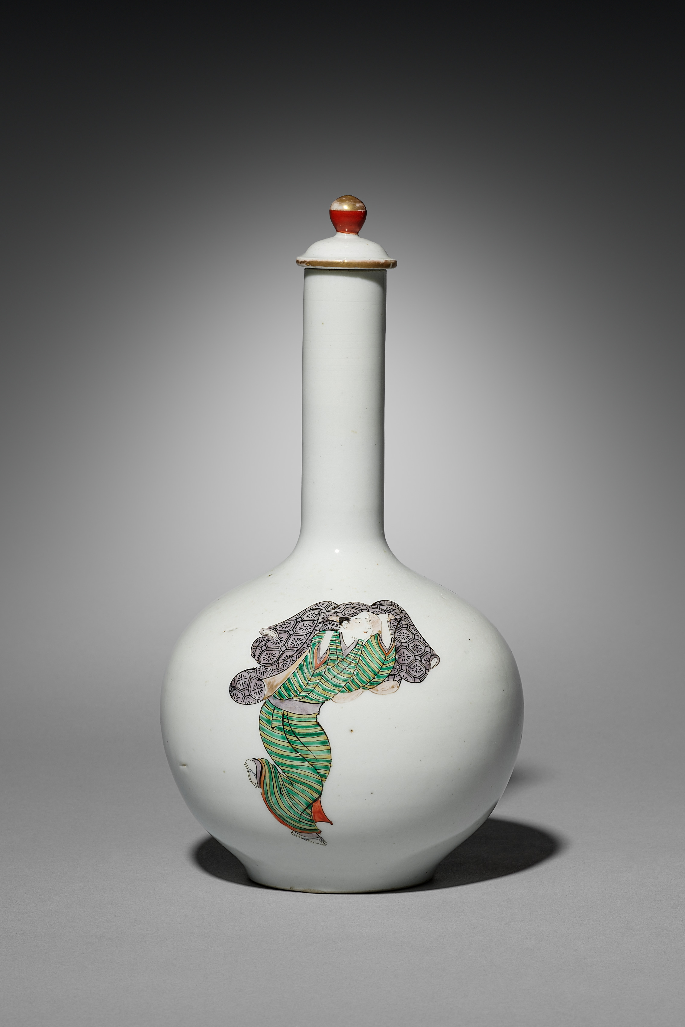 The bottle has a bulbous body and a long neck. The body is white with a rounded bottom. A woman wearing green and red clothing and a large black hairdo is painted on the side. The neck is white with a red and gold knob on the top. The lid is white with a gold rim. The background is gray and white. The bottle appears to be a sake bottle, as indicated by the title. The artist of the piece is not visually identifiable.