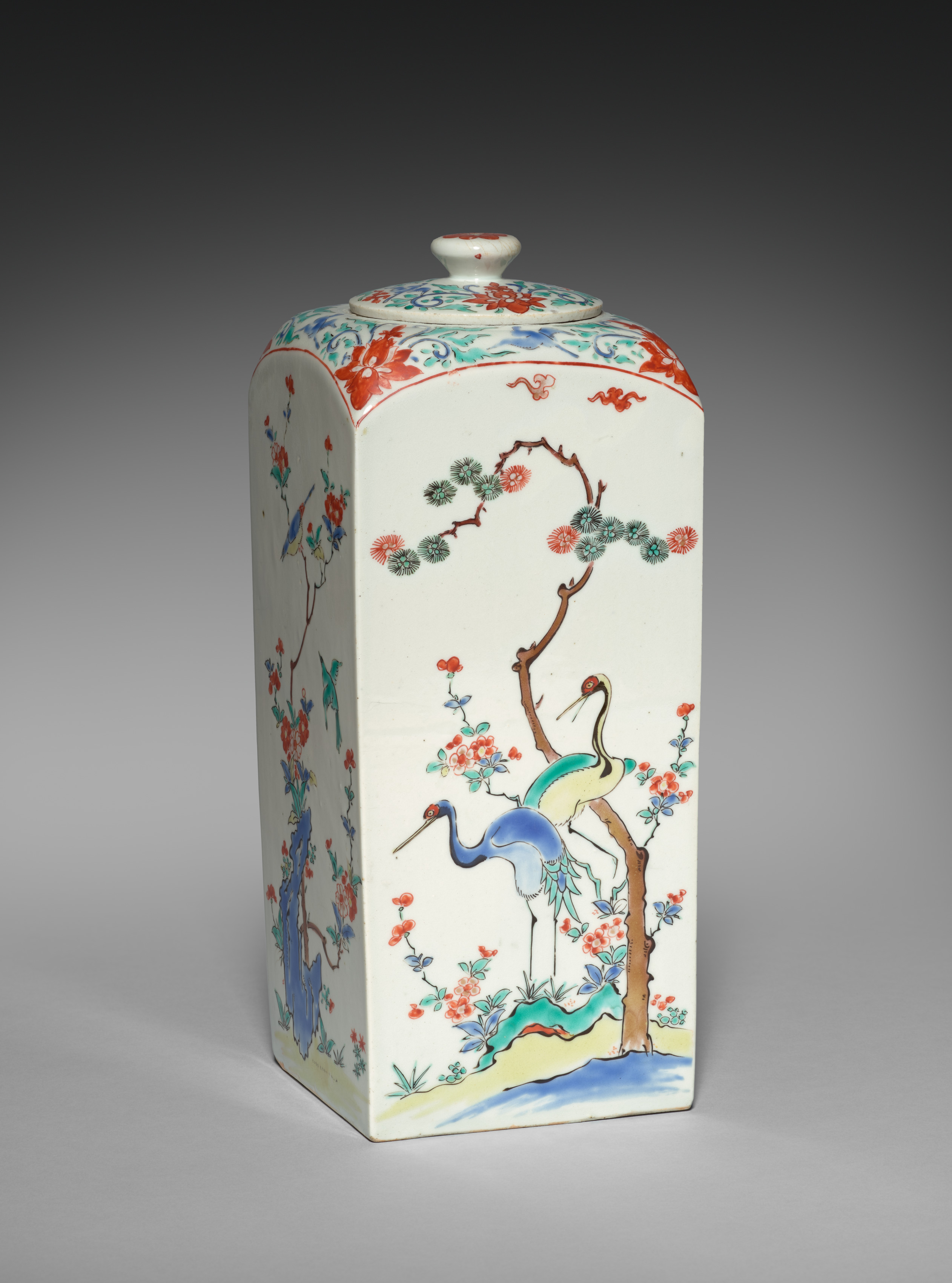 White square jar with a lid, decorated with colorful floral patterns and two cranes standing on a tree branch. The jar has a flat top and a small knob on the lid. The body of the jar is adorned with a scene of two cranes, one blue and one green, standing on a tree branch surrounded by red flowers and green leaves. The jar's sides and top feature additional floral patterns in red, blue, and green. The background of the image is a gradient of dark gray to light gray. Square Jar with Birds and Flowers by an unknown artist.