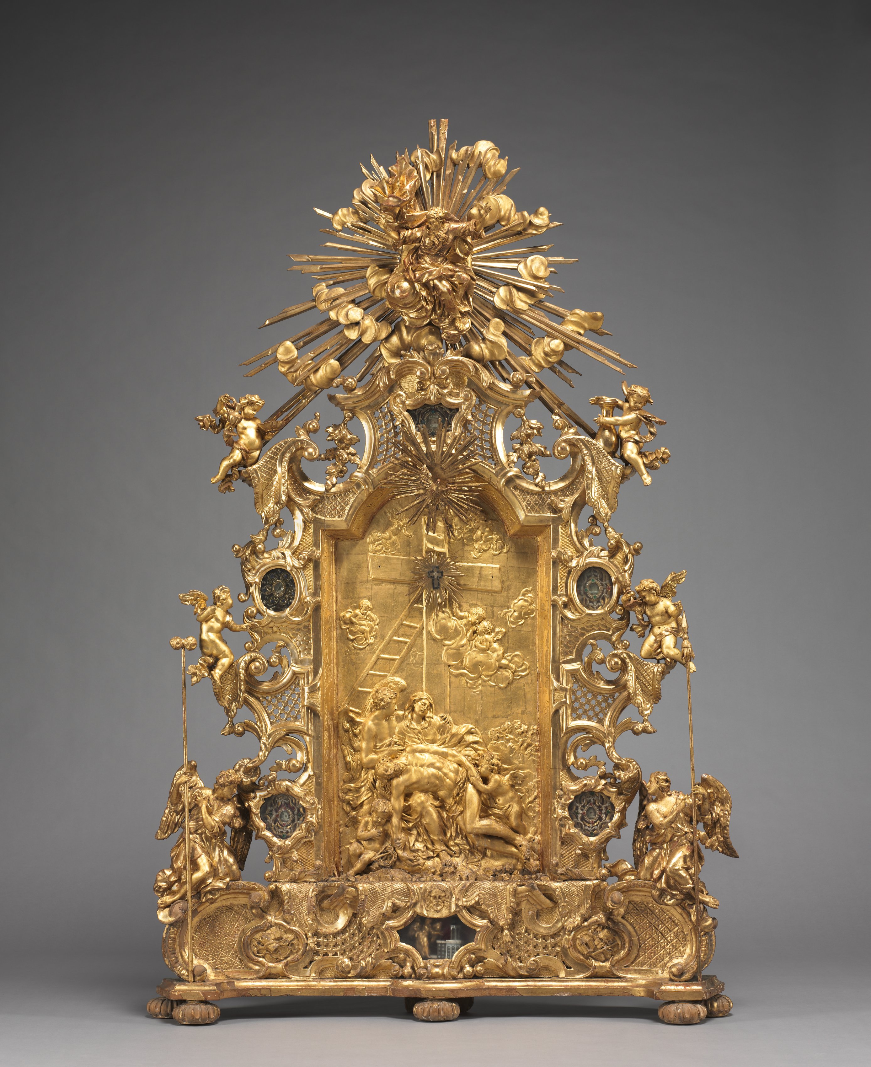 Golden-colored altarpiece with relics. The altarpiece has a rectangular base with a flat bottom and four small feet. There are two large vertical sections on either side with intricate carvings of cherubs and other figures. In the center, there is a large archway with a scene depicting several figures, possibly a religious scene. Above the archway, there is a large sunburst design with rays extending outward. The entire piece is ornately decorated with gold-colored metalwork and features several small circular objects, possibly relics, set into the frame. The background of the image is a gradient gray. The altarpiece is by Joseph Matthias Götz.